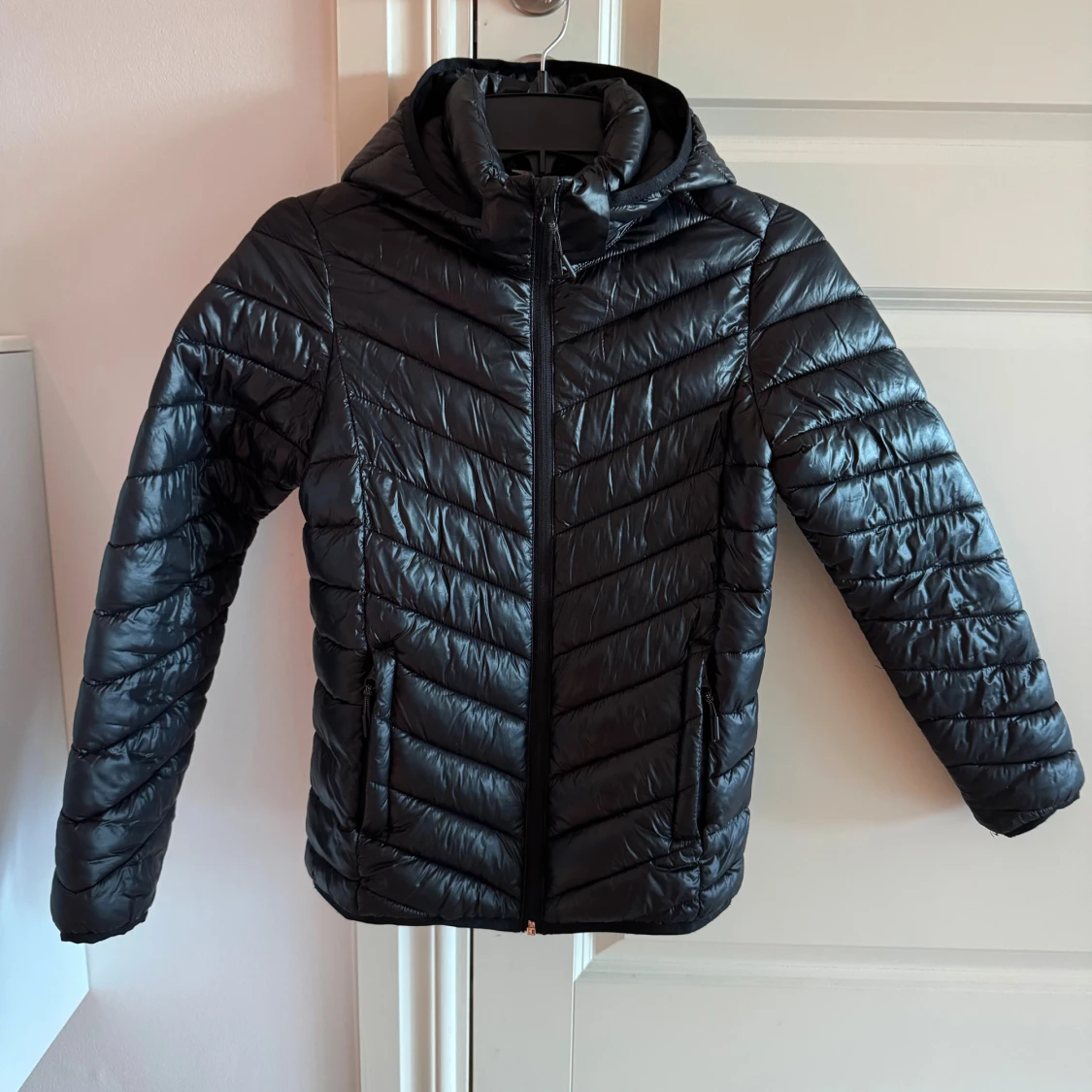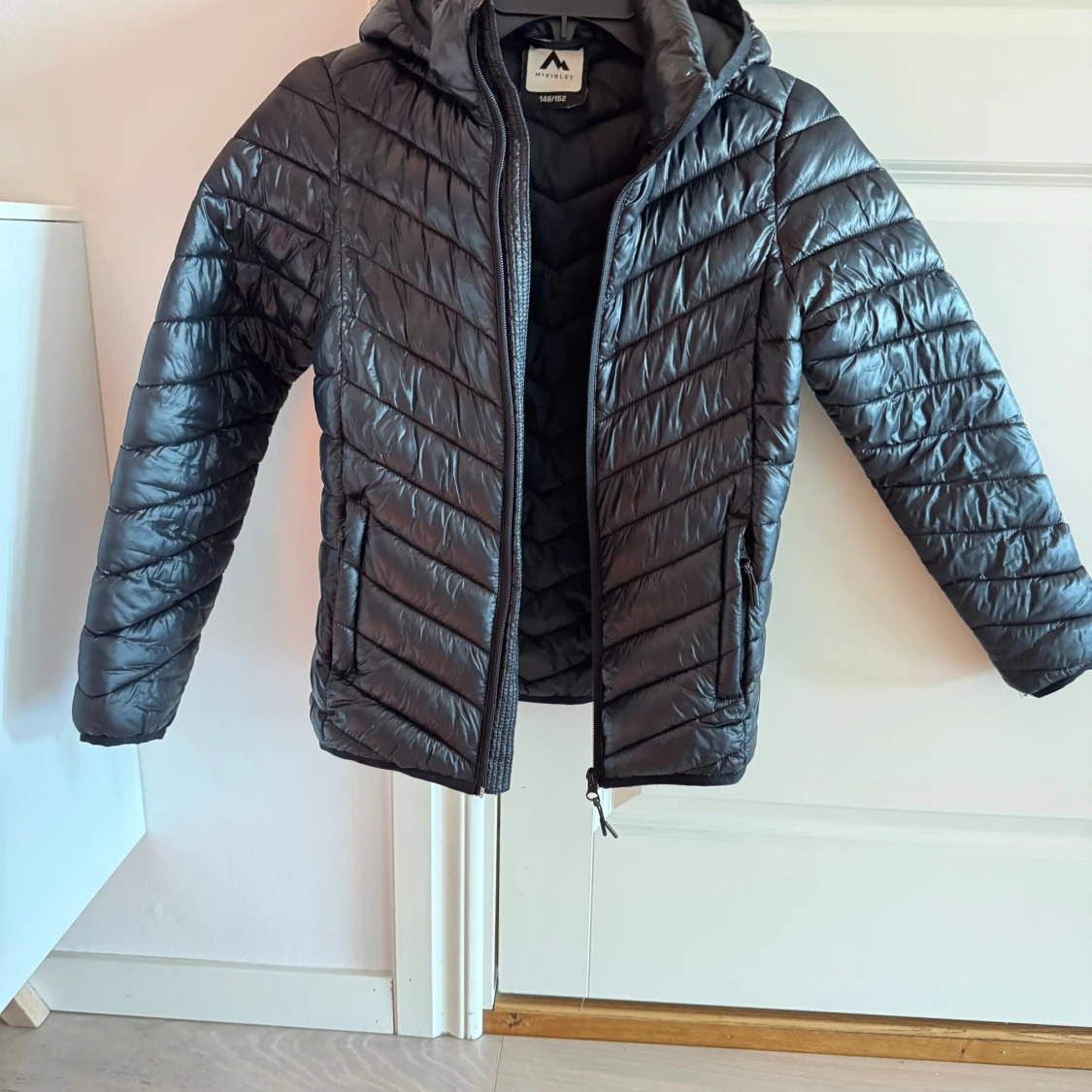 Svart dunjacka från McKinley med huva och dragkedja framtill. Passar höst eller lite mildare vinterdagar. Jackan har ett stilrent, quiltat mönster och två fickor med dragkedja.