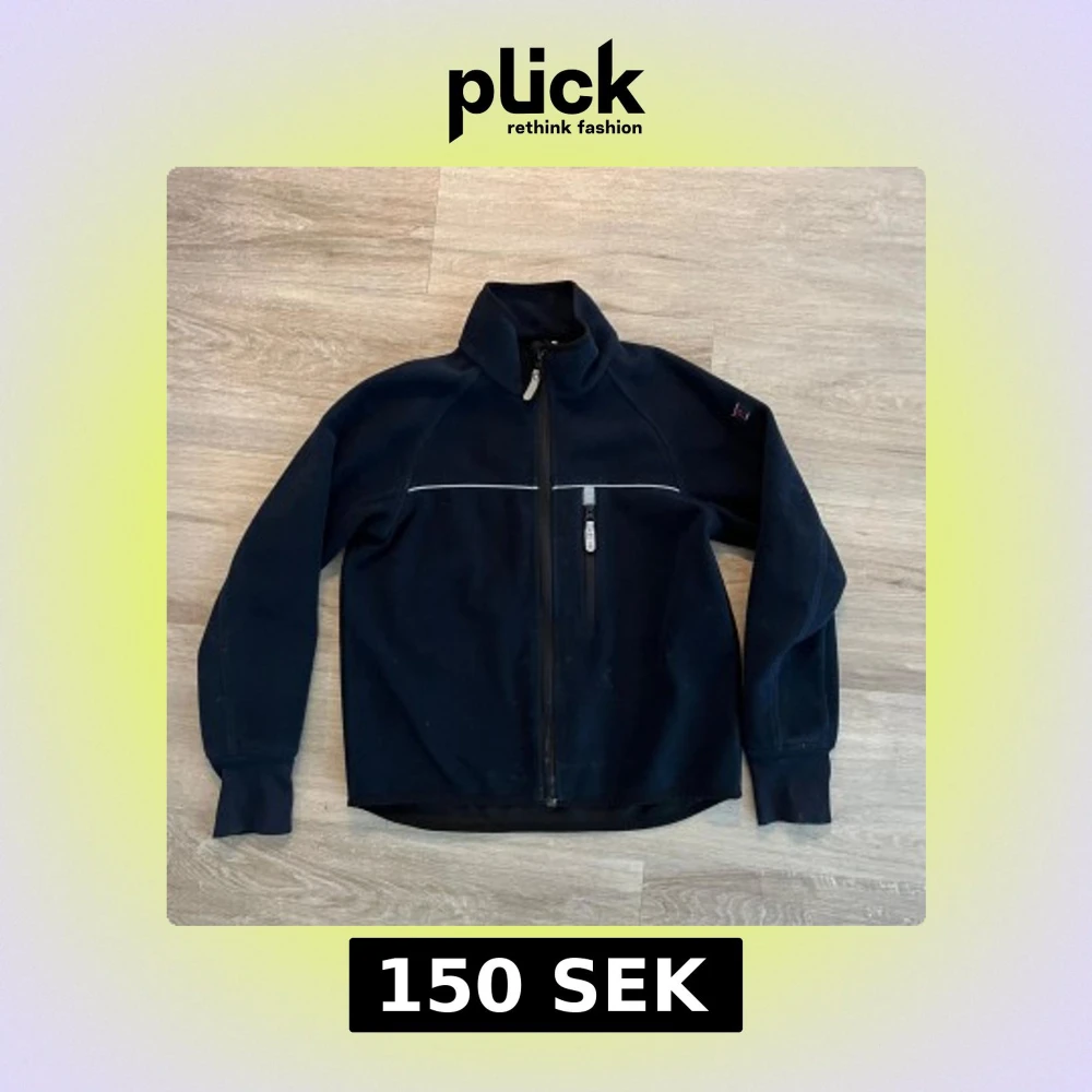 Mörkblå fleecejacka från Polarn O. Pyret med hög krage och hel dragkedja framtill. Jackan har en bröstficka med dragkedja och en tunn vit linje över bröstet. Perfekt för kyliga dagar.