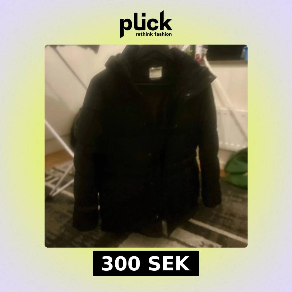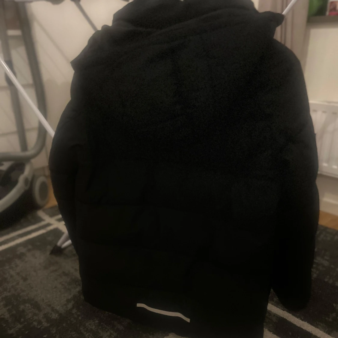 Säljer en svart pufferjacka med huva. Jackan har långa ärmar och en dragkedja framtill. Perfekt för kyligare dagar.