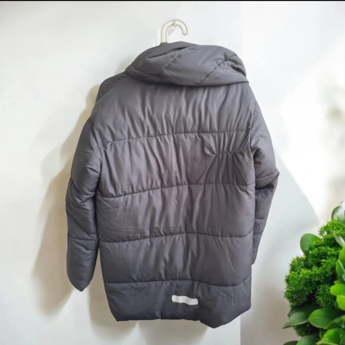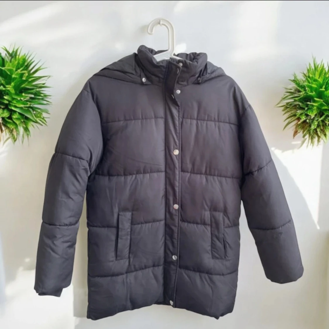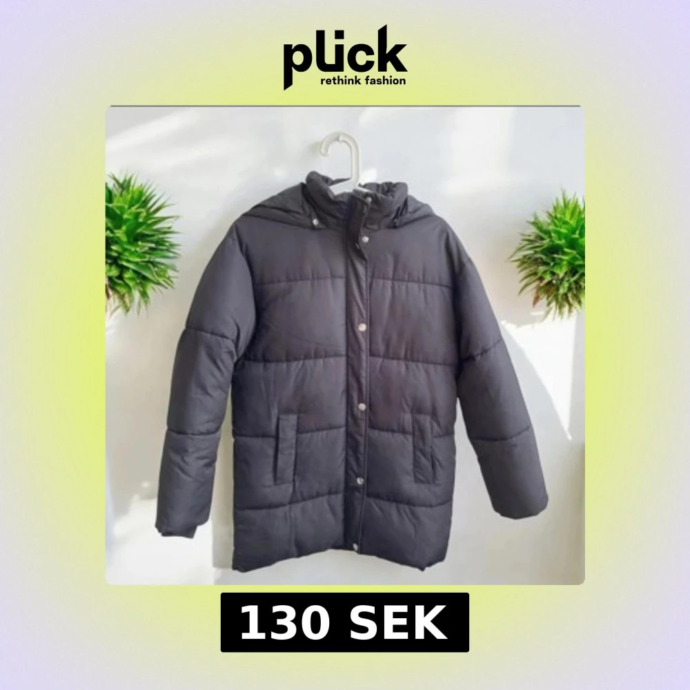 Säljer en svart pufferjacka med huva och raka linjer. Jackan har dragkedja och tryckknappar framtill samt två stora fickor på sidorna. Perfekt för kalla dagar och enkel att matcha med olika outfits. Finns en reva som sluta ihop på baksidan , se bild