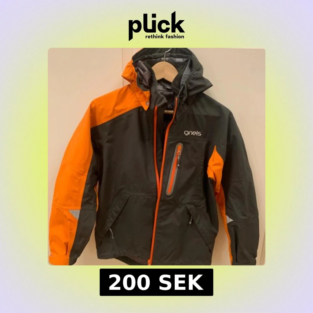 Säljer en Gneis Abisko Jacket i svart och orange med huva och flera fickor. Jackan har dragkedja framtill och coola detaljer som reflekterande partier. Materialet är 100% polyamid, perfekt för utomhusaktiviteter. Märket syns både fram och bak på jackan.