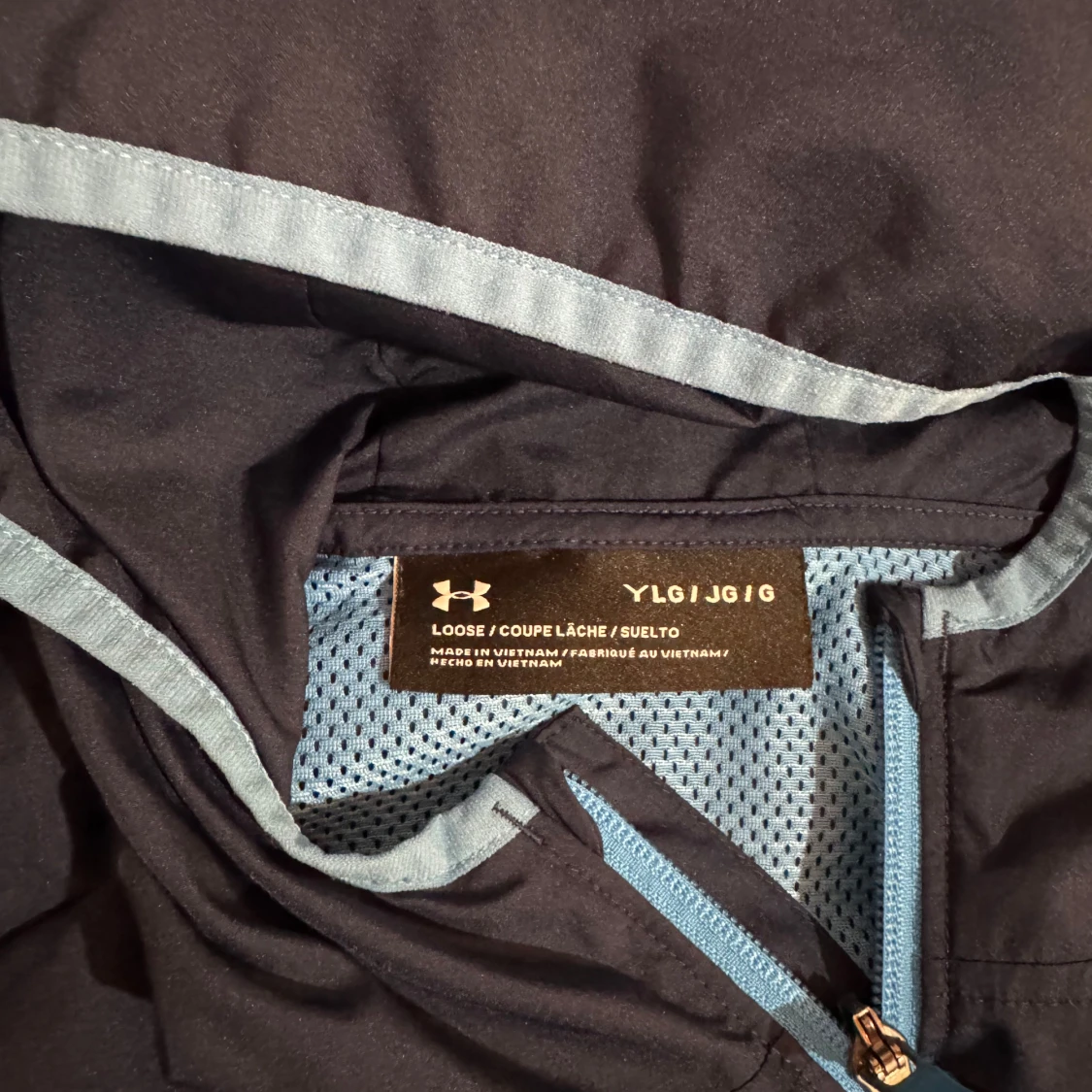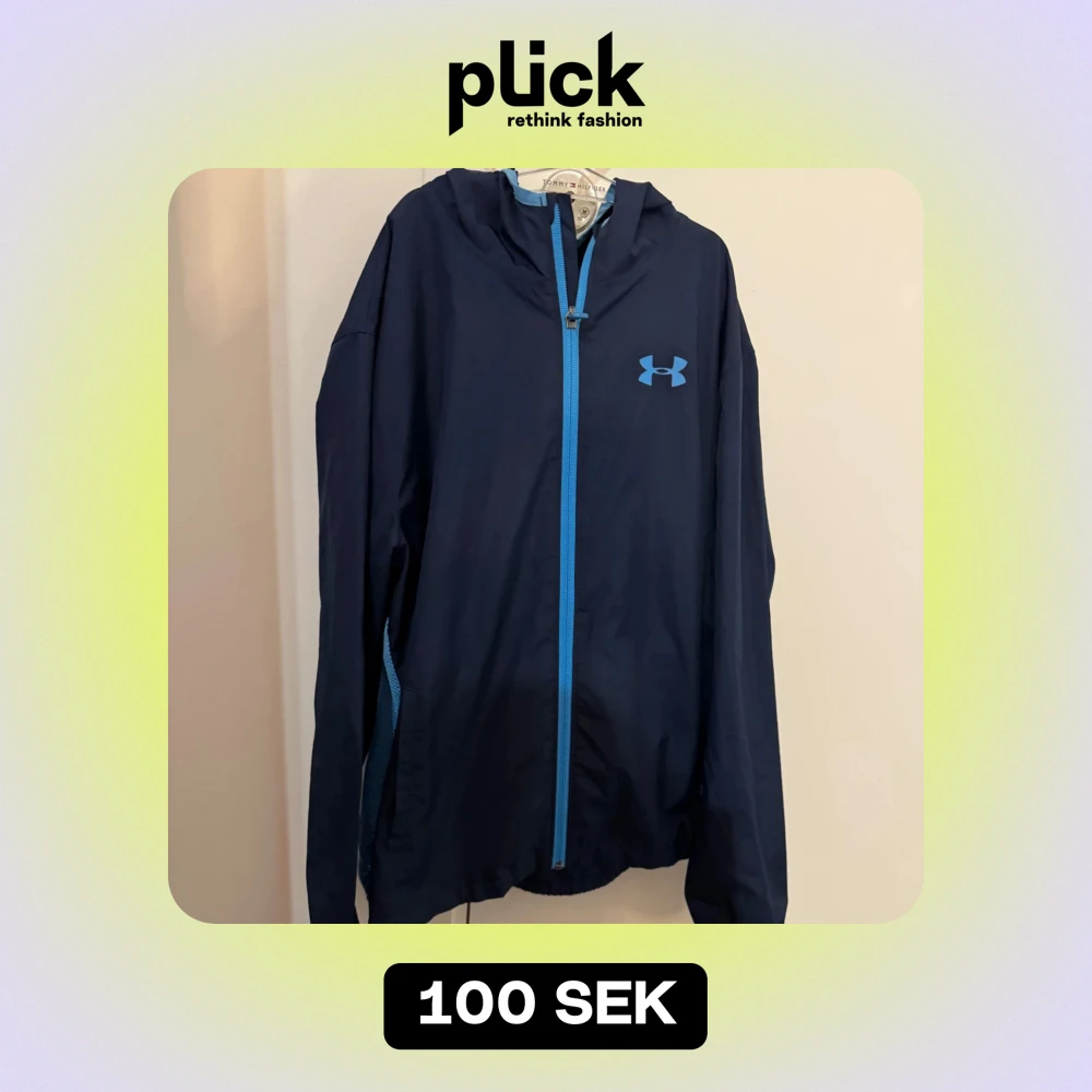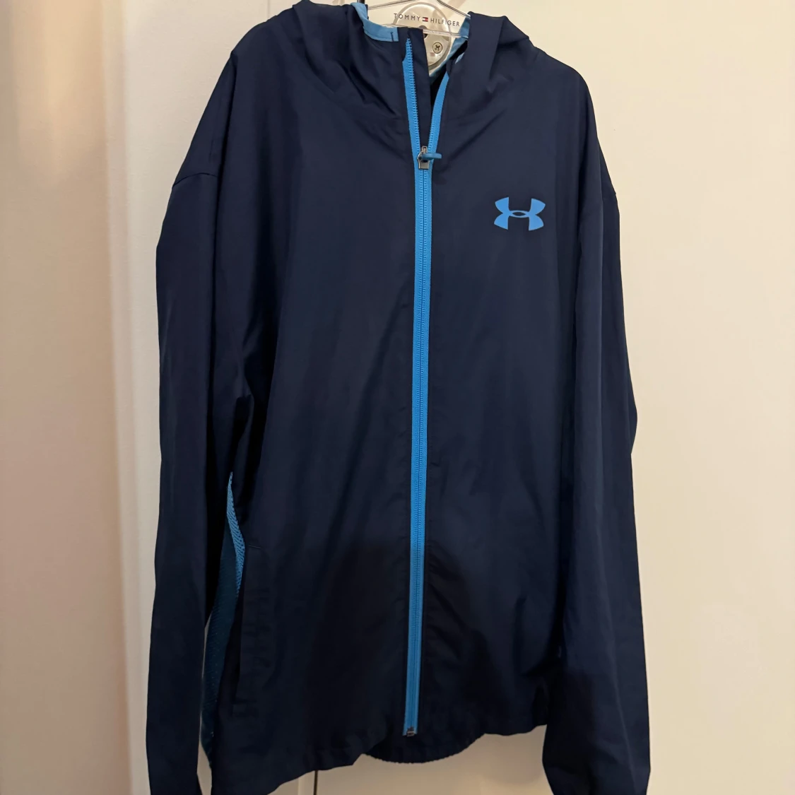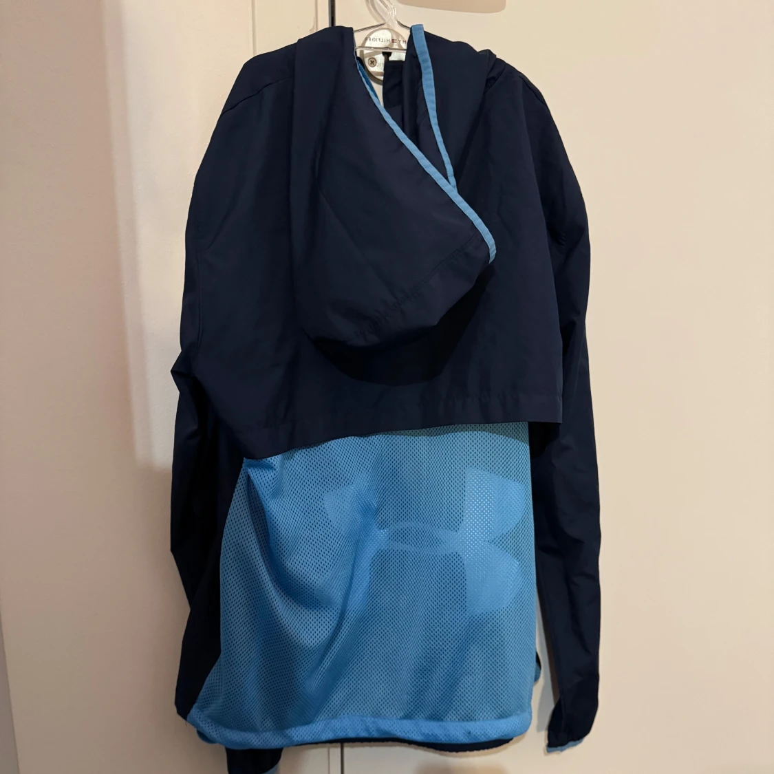 Säljer en mörkblå vindjacka från Under Armour med ljusblå detaljer och dragkedja. Jackan har en luva och meshpanel på baksidan för extra ventilation. Perfekt för träning eller som en lätt ytterjacka.
