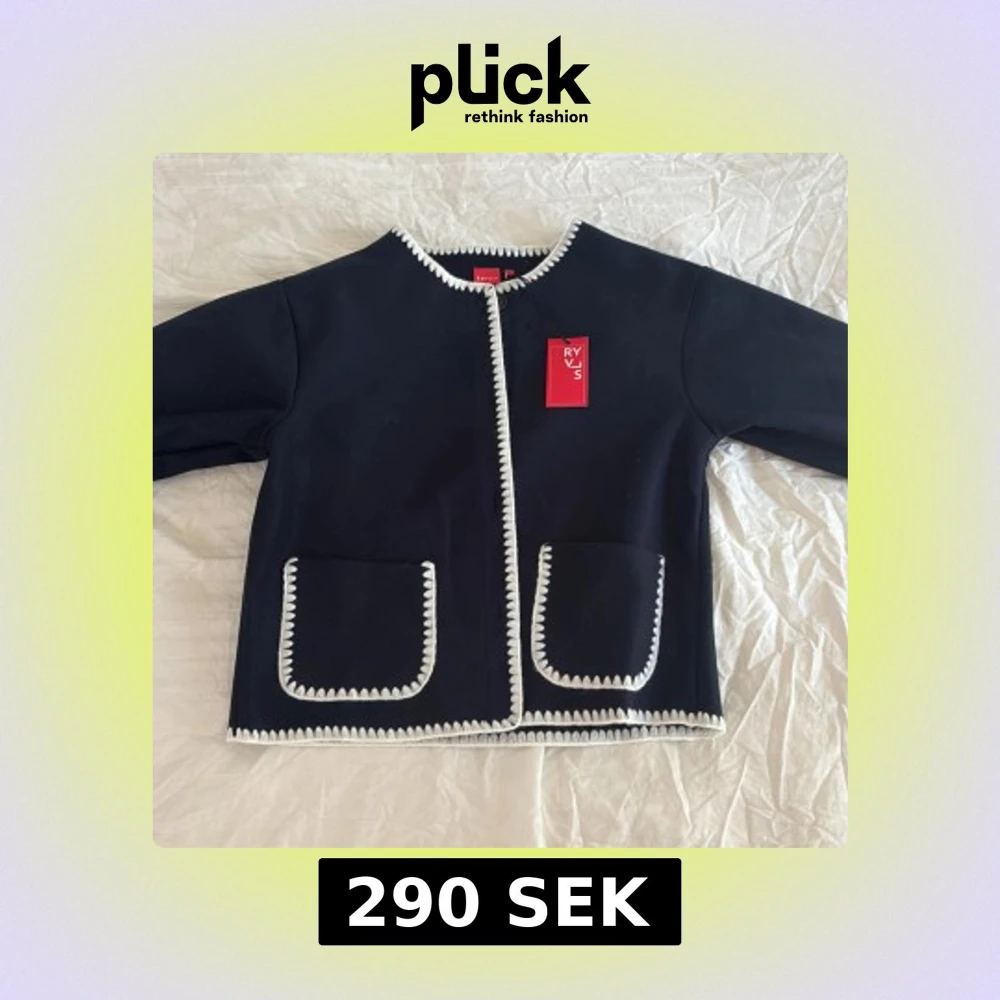 Mörkblå cardigan jacka från RYVLS med vita virkade kanter längs ärmar, fickor och öppning. Jackan har två stora fickor framtill och är långärmad med en rak, boxig passform. Materialet är mjukt och känns som ull. Perfekt för dig som gillar stilrena detaljer.