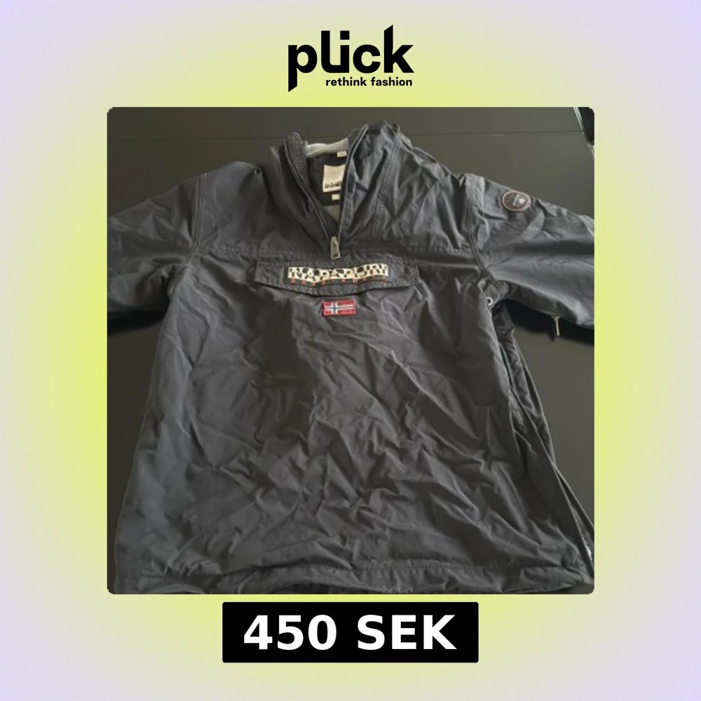 Säljer en svart vindjacka från Napapijri med halv dragkedja och stor logga på bröstet. Jackan har norsk flagga framtill, huva och praktisk ficka på magen. Perfekt för blåsiga dagar och streetwear-stil.