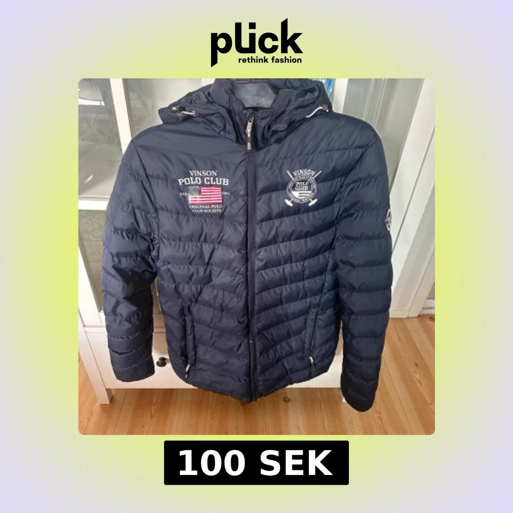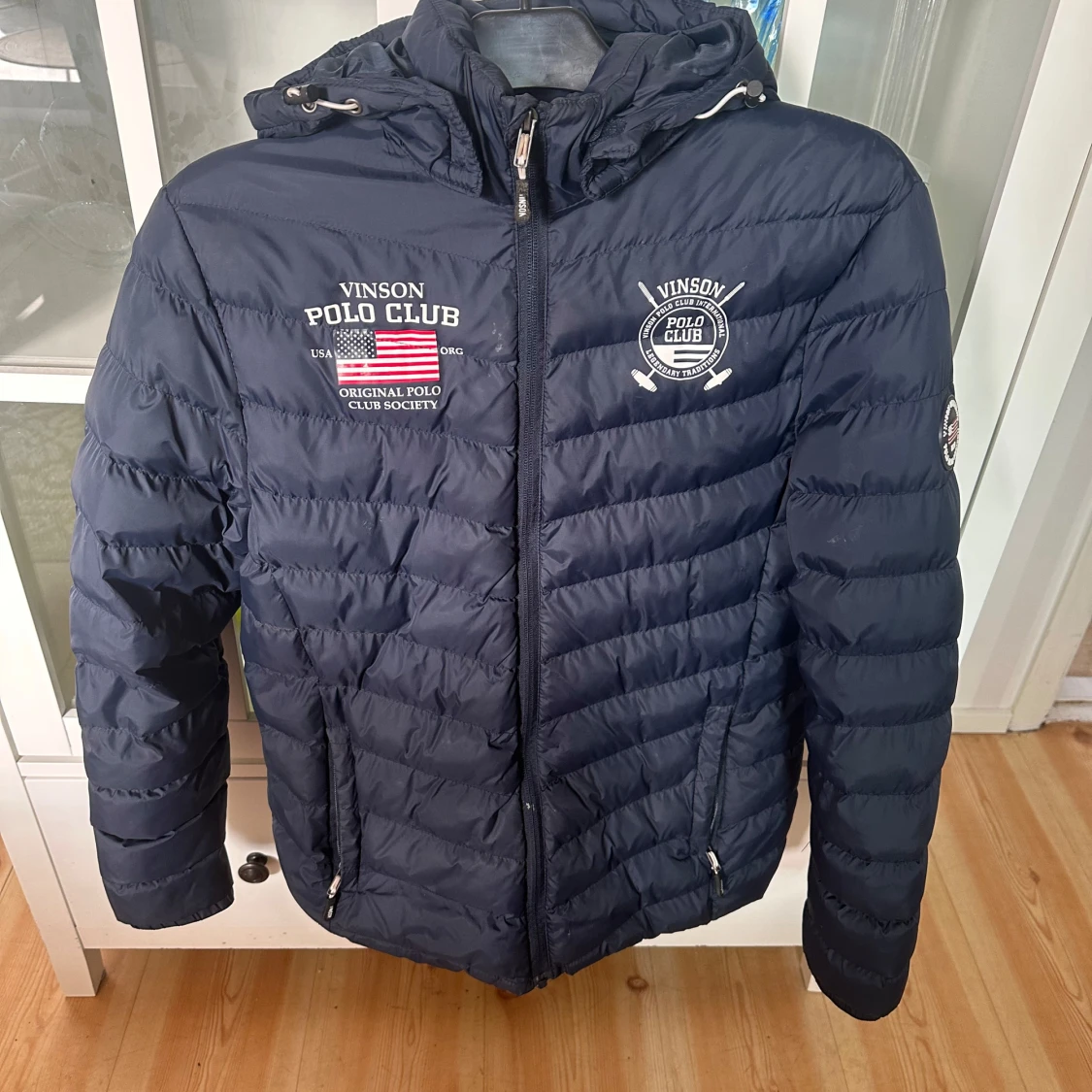 Snygg mörkblå dunjacka från Vinson Polo Club med broderade loggor på bröstet och ärmen. Jackan har huva, dragkedja framtill och två fickor med dragkedja. Perfekt för kyliga dagar och har en sportig vibe.