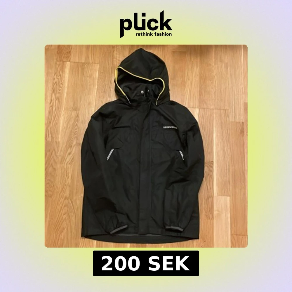 Säljer en svart regnjacka från Didriksons med huva och gul detaljkant. Jackan är 100% vattentät och har dragkedja framtill. Perfekt för regniga dagar och håller dig torr oavsett väder. 🖤