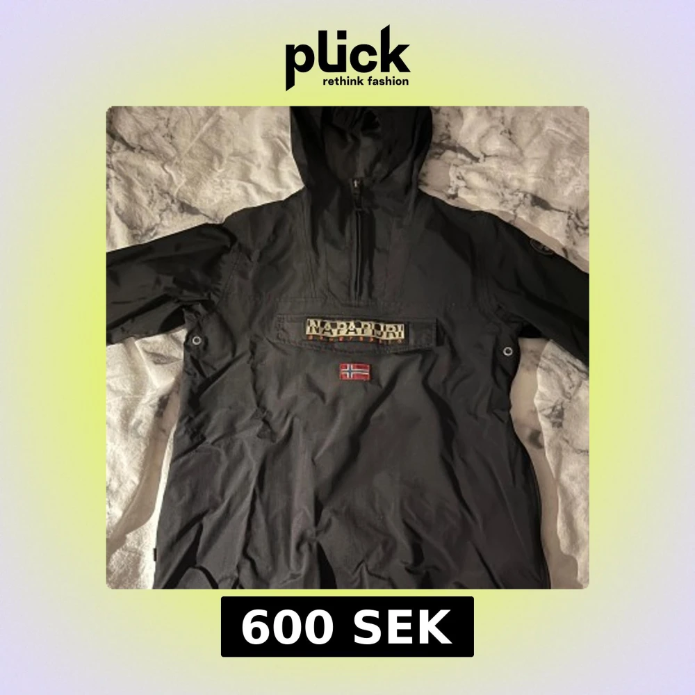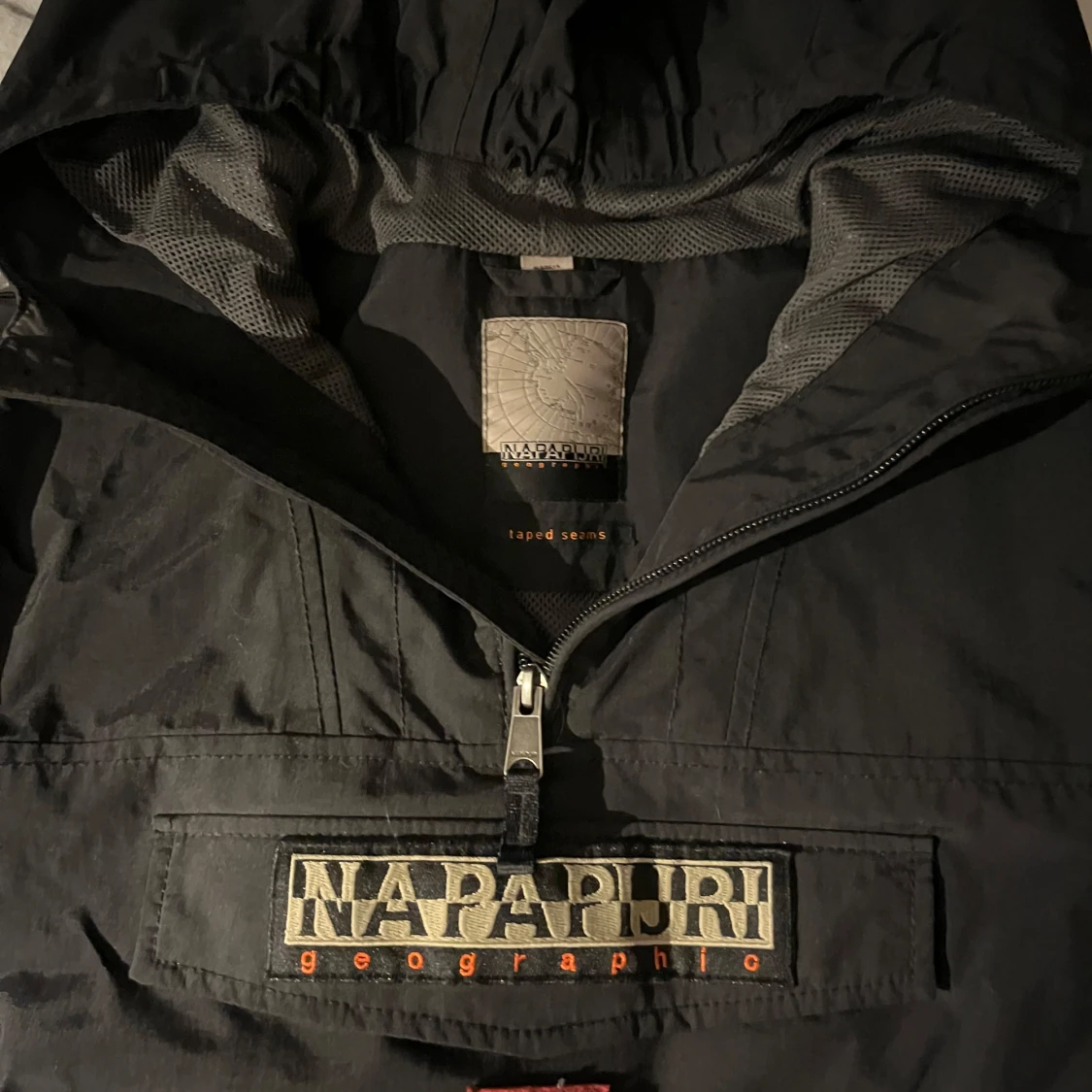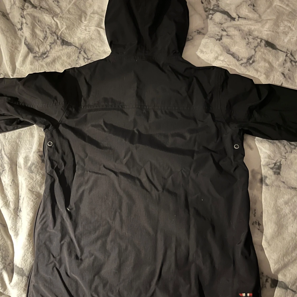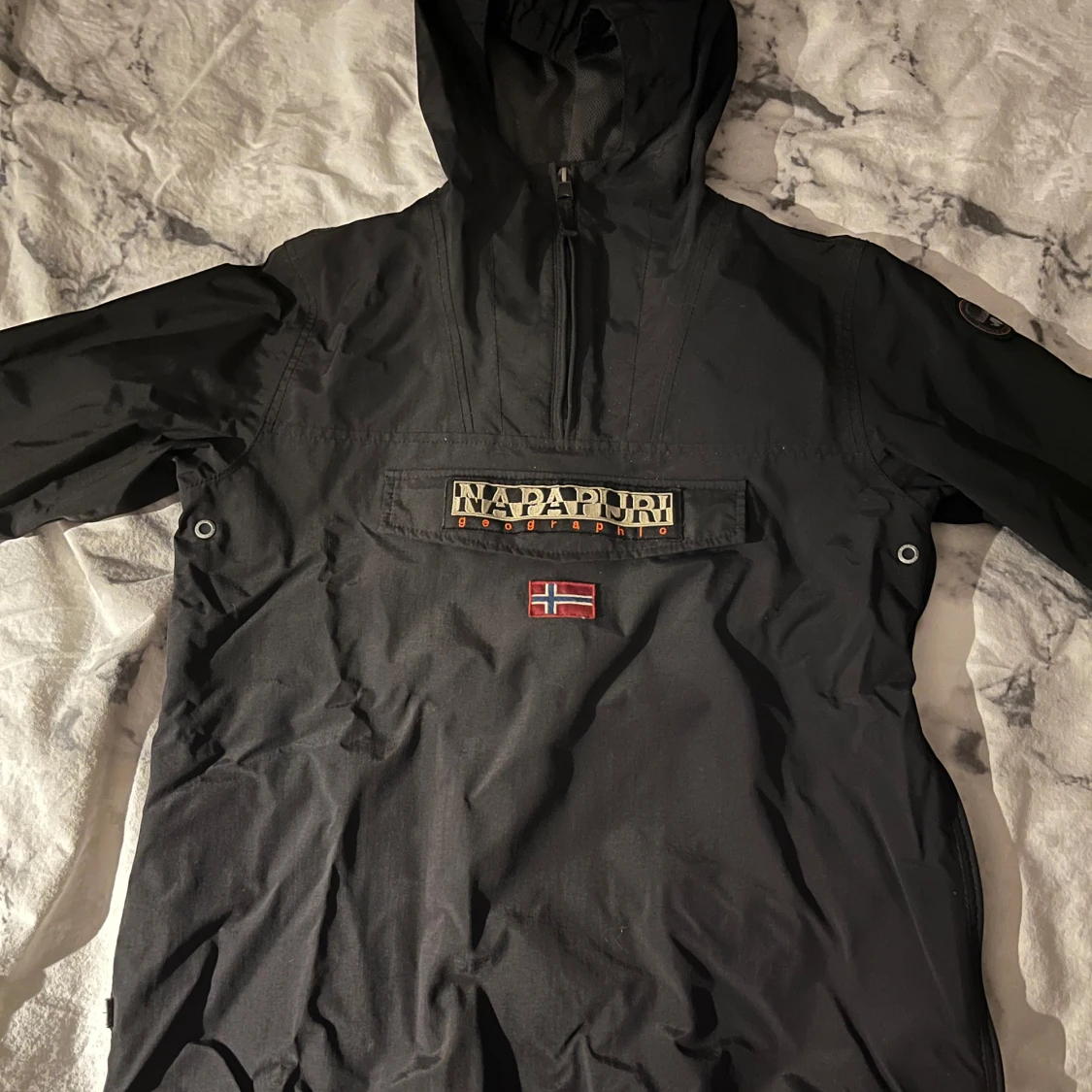 Säljer en stilren svart halfzip vindjacka från Napapijri med huva. Jackan är tunn men passar perfekt för blåsiga och regniga dagar.