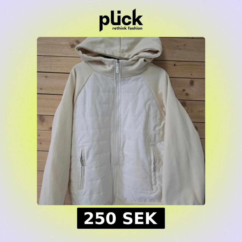 Oanvänd Snygg beige hoodiejacka med quiltad framsida och dragkedja. Jackan har huva och två fickor med dragkedja. Perfekt för lager-på-lager och chill vardagsstil. Skulle säga storlek är ca 164