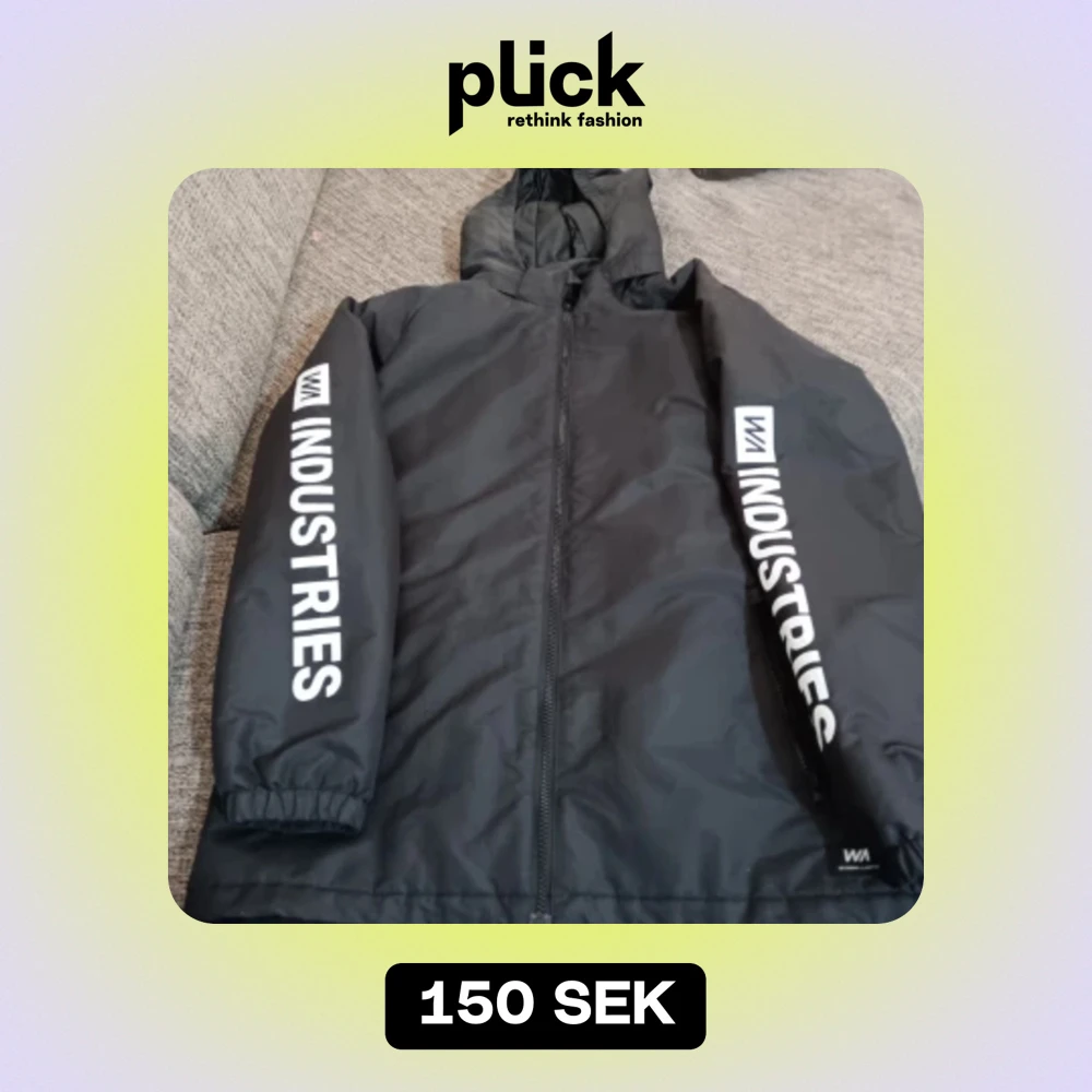 Säljer en svart vindjacka från Warp med tryck på ärmarna. Jackan har en dragkedja framtill och en huva för extra skydd mot väder. Perfekt för blåsiga dagar och har en cool streetwear-look. Passar bra till både vardag och fritid.