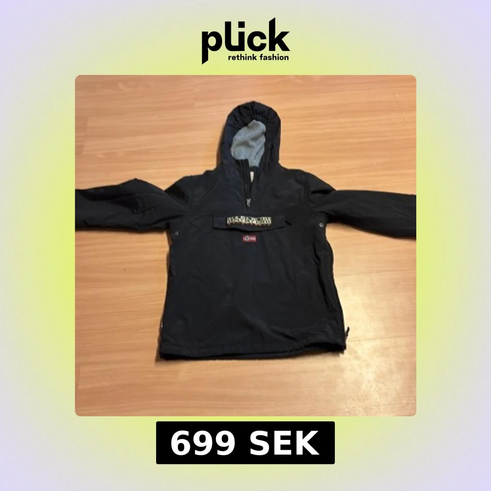 Svart vindjacka från Napapijri med huva och halv dragkedja framtill. Jackan har en stor ficka på magen med norsk flagga och logotyp. Priset är inte hugget i sten så bara att höra av er vid funderingar
