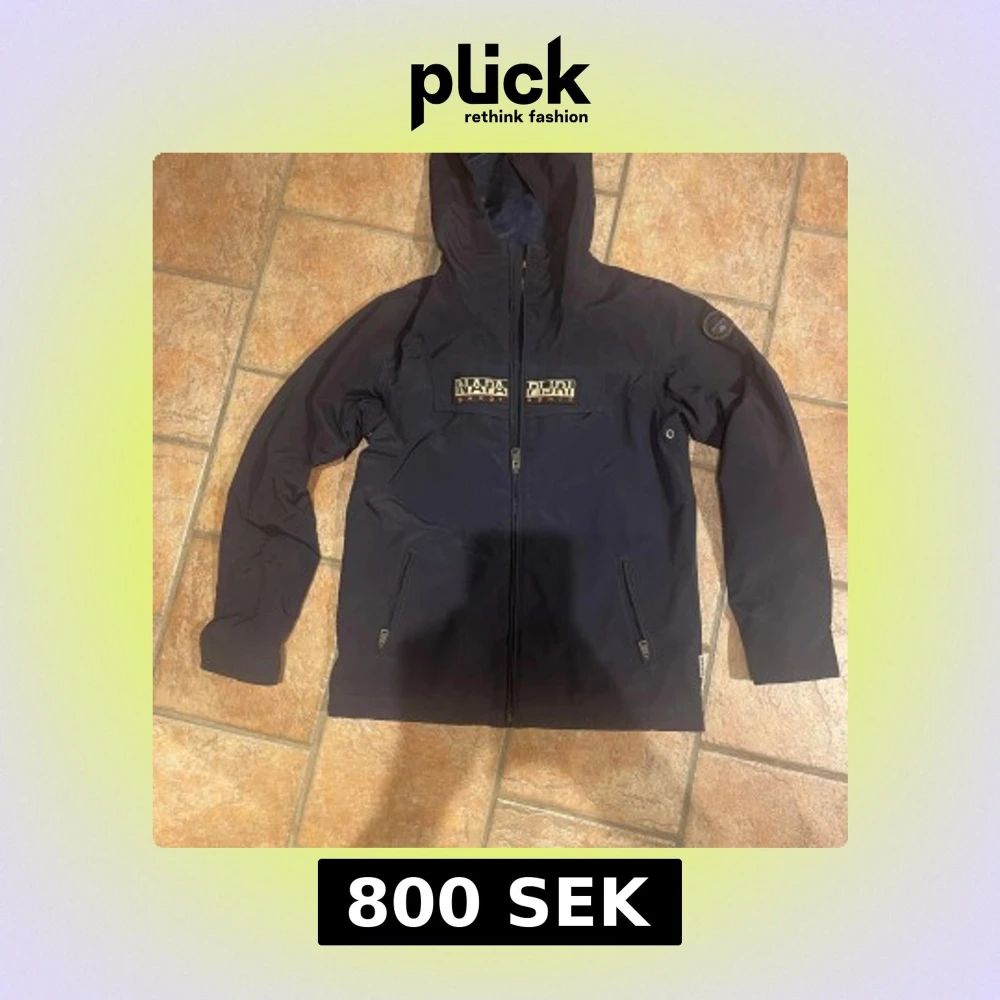 Snygg mörkblå vindjacka från Napapijri med huva och dragkedja framtill. Jackan har meshfoder och stort Napapijri-märke på bröstet. Nypris 1800