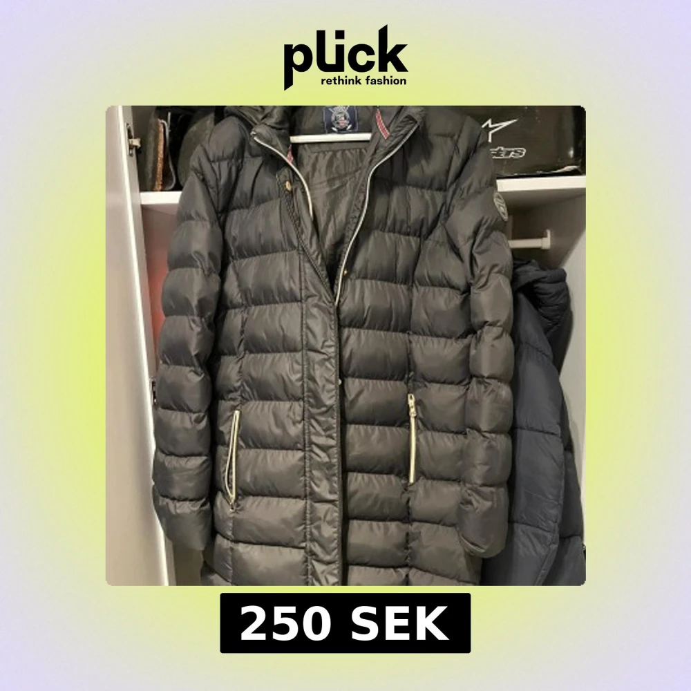 Säljer en svart lång pufferjacka från Vinson Polo Club med huva och snygga vita dragkedjor på fickorna. Jackan har quiltad design och ett stilrent märke på ärmen. Perfekt för kalla dagar och har en modern look som passar till streetwear.