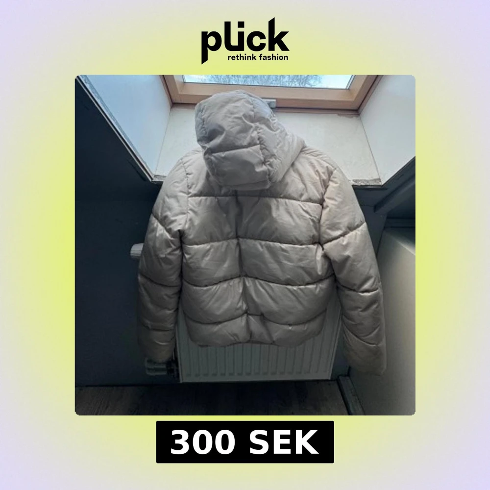Säljer en beige pufferjacka med huva och dragkedja framtill. Jackan har långa ärmar och två fickor med dragkedja. Perfekt för kyliga dagar. Sitter som en S