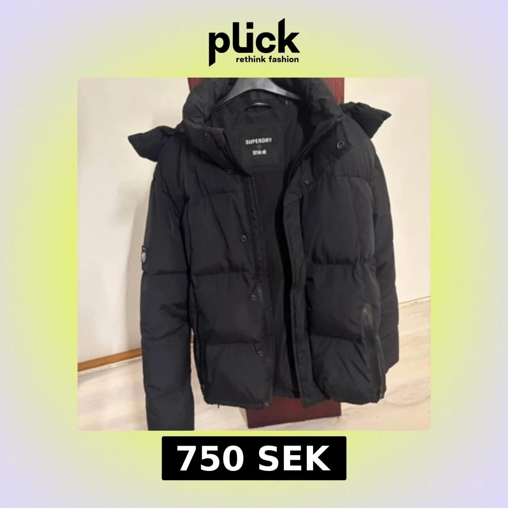 Säljer en svart pufferjacka från Superdry med huva och dragkedja. Jackan har en klassisk boxig passform, stora fickor och diskret logga på armen. Perfekt för kalla dagar och riktigt snygg till streetwear-stilen.