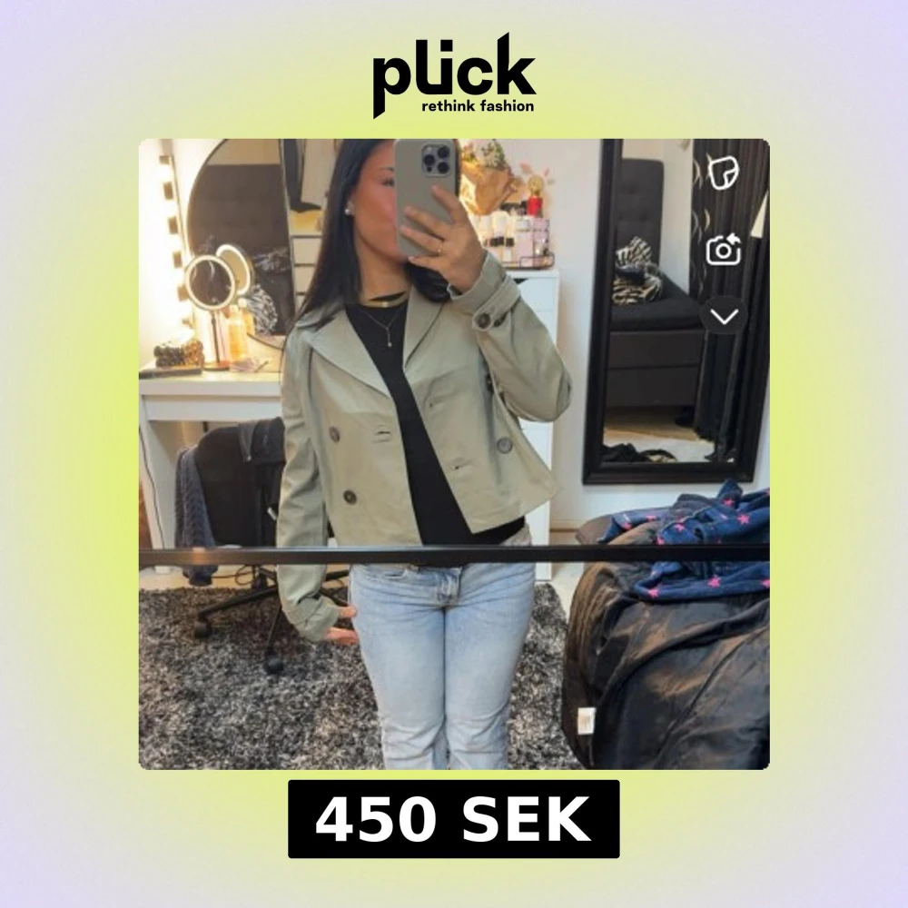 Snygg croppad trenchcoat i beige med dubbelknäppning och stora knappar. Jackan har klassisk krage och långa ärmar med knappdetalj vid ärmslut. Perfekt för dig som vill ha en stilren och trendig look.