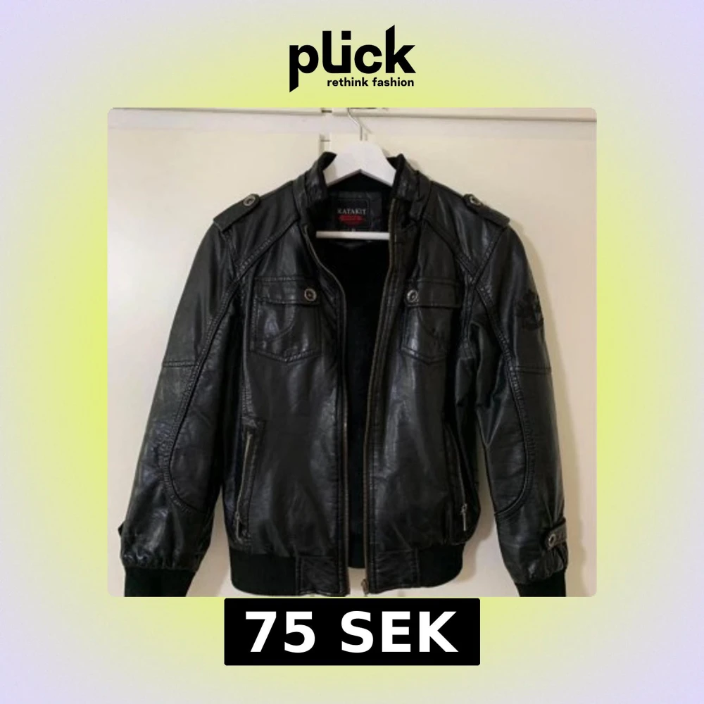 Säljer en svart skinnjacka från Katakit med dragkedja och flera fickor framtill. Jackan har långa ärmar, ribbade muddar och dekorativa knappar på axlarna. Perfekt för dig som vill ha en cool och stilren look.