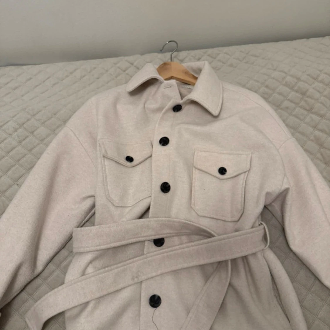Snygg beige overshirt från NLY Trend med bälte i midjan och svarta knappar. Jackan har två bröstfickor med lock och klassisk krage. Perfekt för lager-på-lager och en clean look.