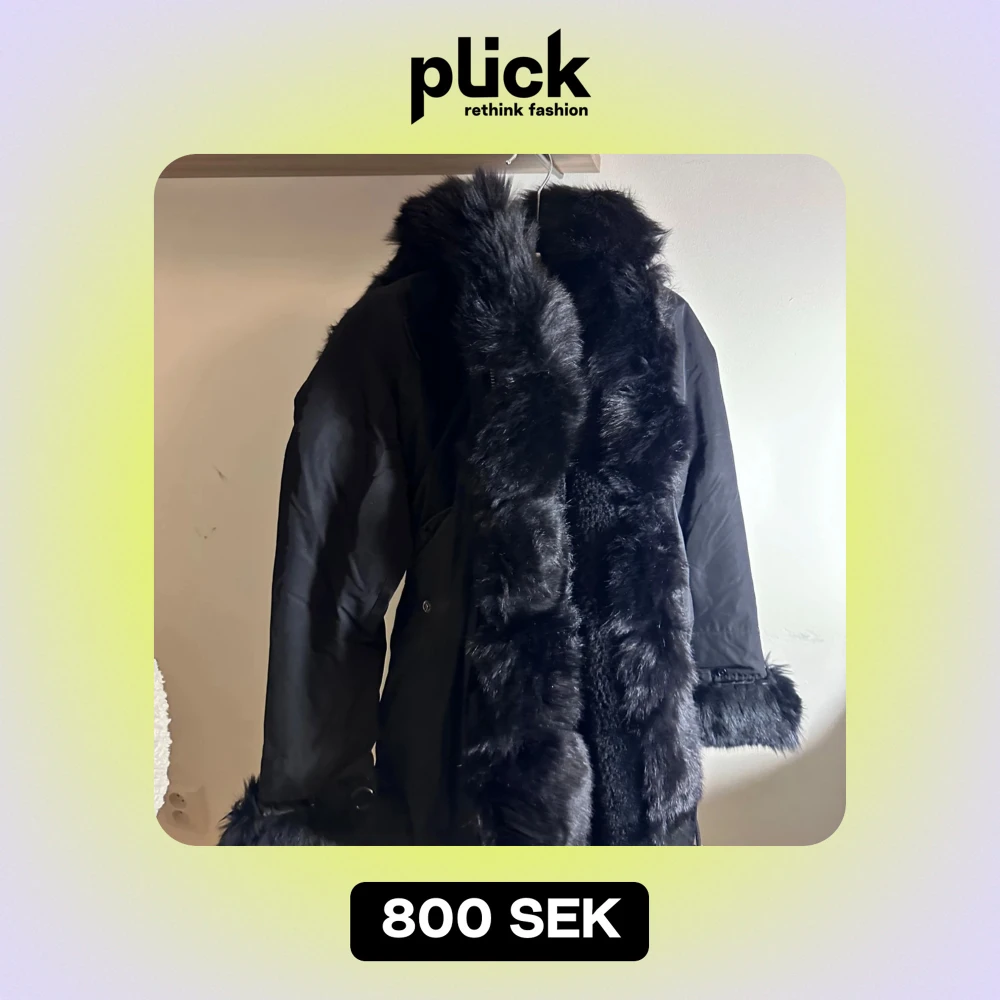 Säljer en svart pälsjacka med fluffigt foder inuti och äkta svart päls vid ärmslut och krage. Perfekt för kalla vinterdagar, Kan spännas för att få en mer figursydd look eller stängas med knapparna. 🖤