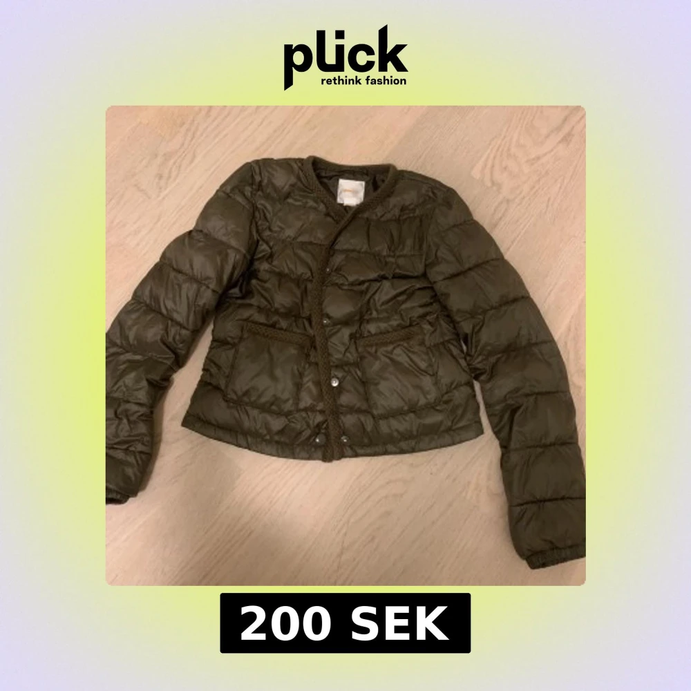 Snygg olivgrön pufferjacka med flätade detaljer längs kanterna och vid fickorna. Jackan har tryckknappar framtill och två stora fickor. Perfekt för dig som vill ha en stilren och trendig look under kyliga dagar.