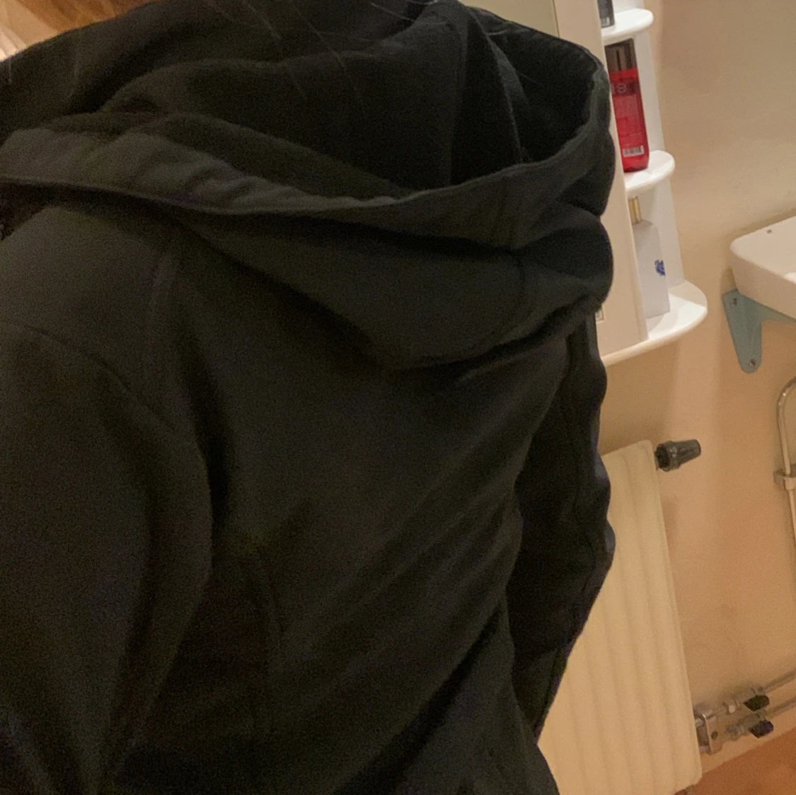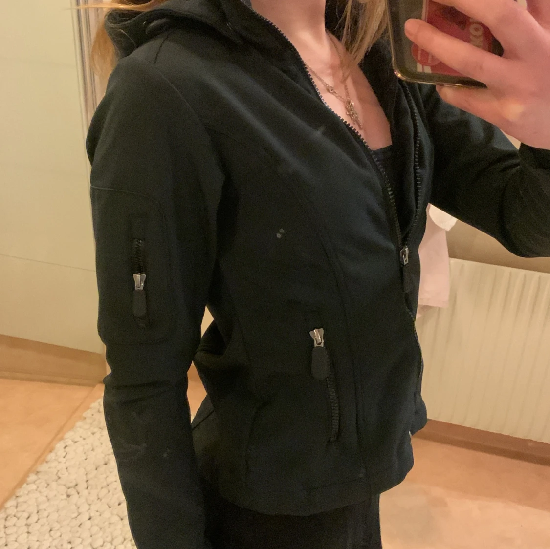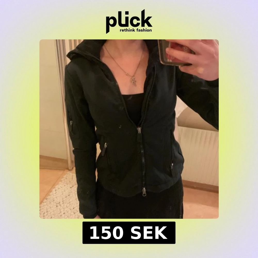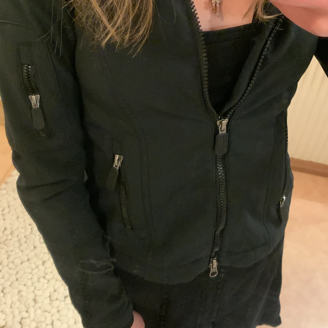 Säljer en svart jacka med huva och flera dragkedjor, både framtill och på ärmen. Jackan har en figurnära passform och en sportig look säljer för att börjar att bli liten för mig 💕