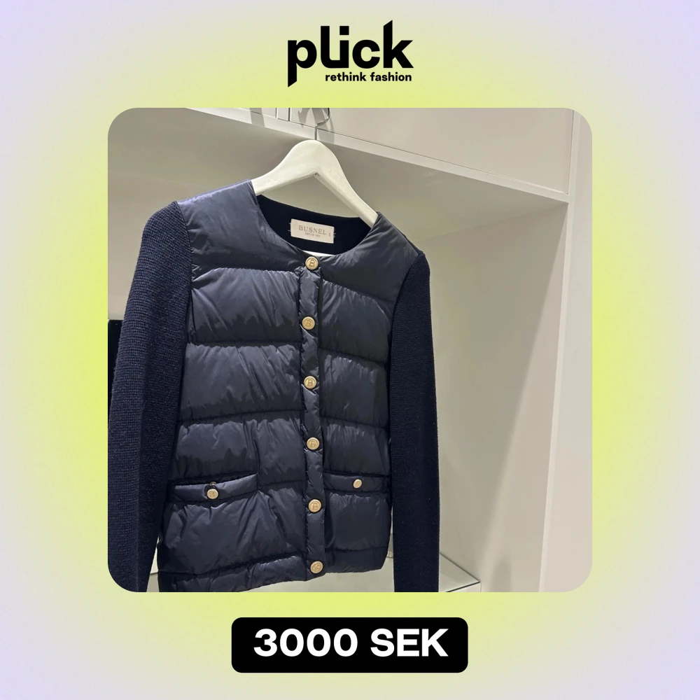 Snygg mörkblå jacka från Busnel med quiltad framsida och stickade ärmar. Den har guldknappar med Busnel-logga och två praktiska fickor fram. Perfekt för höst och vår när du vill vara både stilren och varm.
