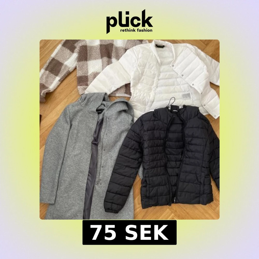 Säljer flera jackor: brun/vit teddyjacka med rutigt mönster, vit och svart pufferjacka med dragkedja, grå rock med huva och en rutig overshirt i svart, grått och vitt från Only. Perfekt för dig som vill variera stilen mellan oversized, croppad och klassiskt. 75 kr styck