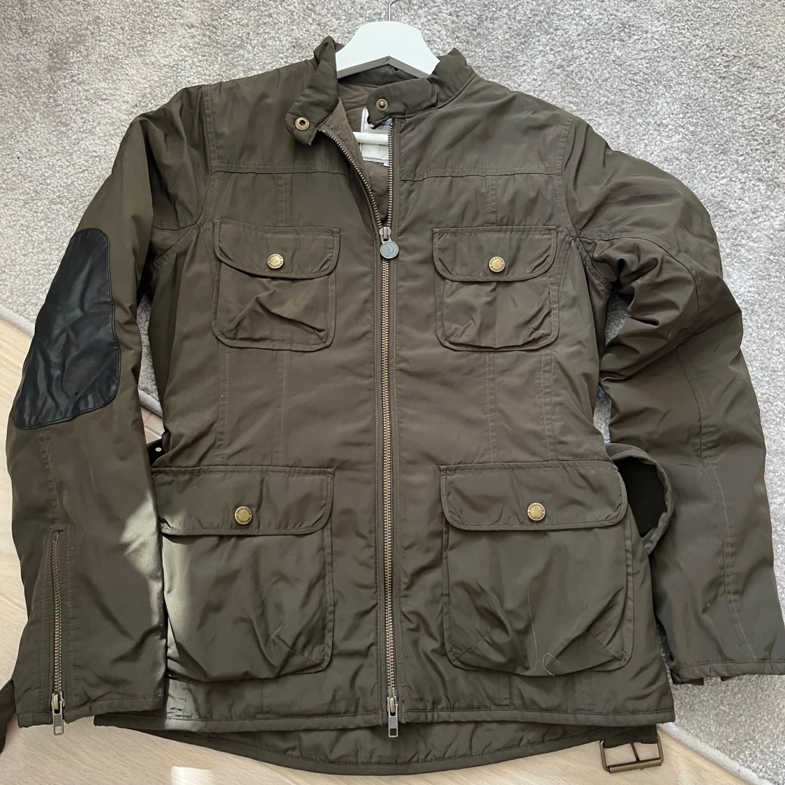 Snygg olivgrön parkajacka från Boomerang med fyra framfickor, dragkedja och knappar. Jackan har svart patch på ena ärmen och ett justerbart bälte i midjan. Perfekt för dig som gillar funktionell stil med coola detaljer.
