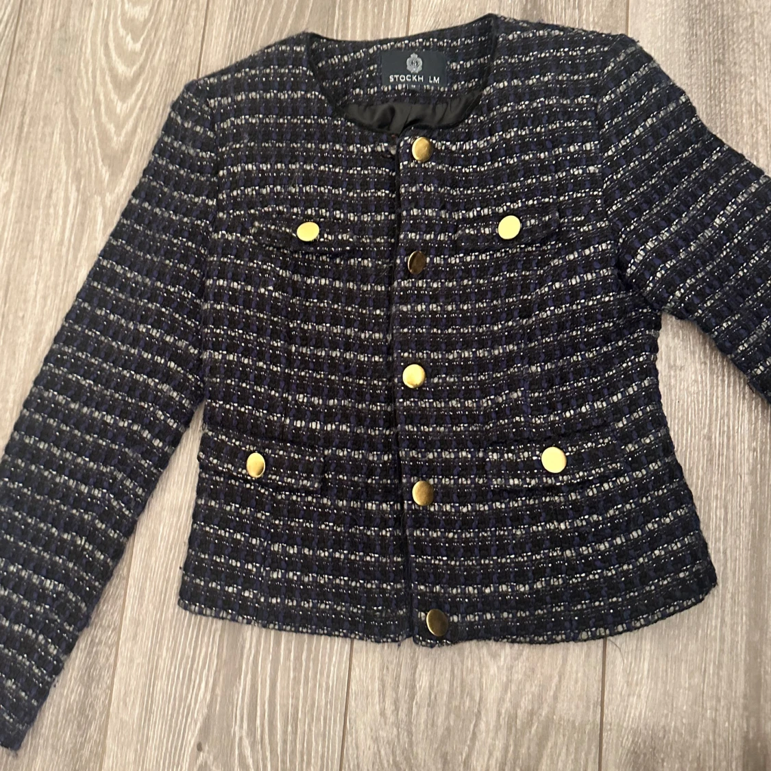Snygg mörkblå kavaj från Stockholm i klassiskt rutigt mönster. Jackan har guldiga knappar framtill och på fickorna, rund halsringning och lång ärm. Materialet är strukturerat och känns lyxigt, perfekt för att lyfta din outfit. Använd 1 gång