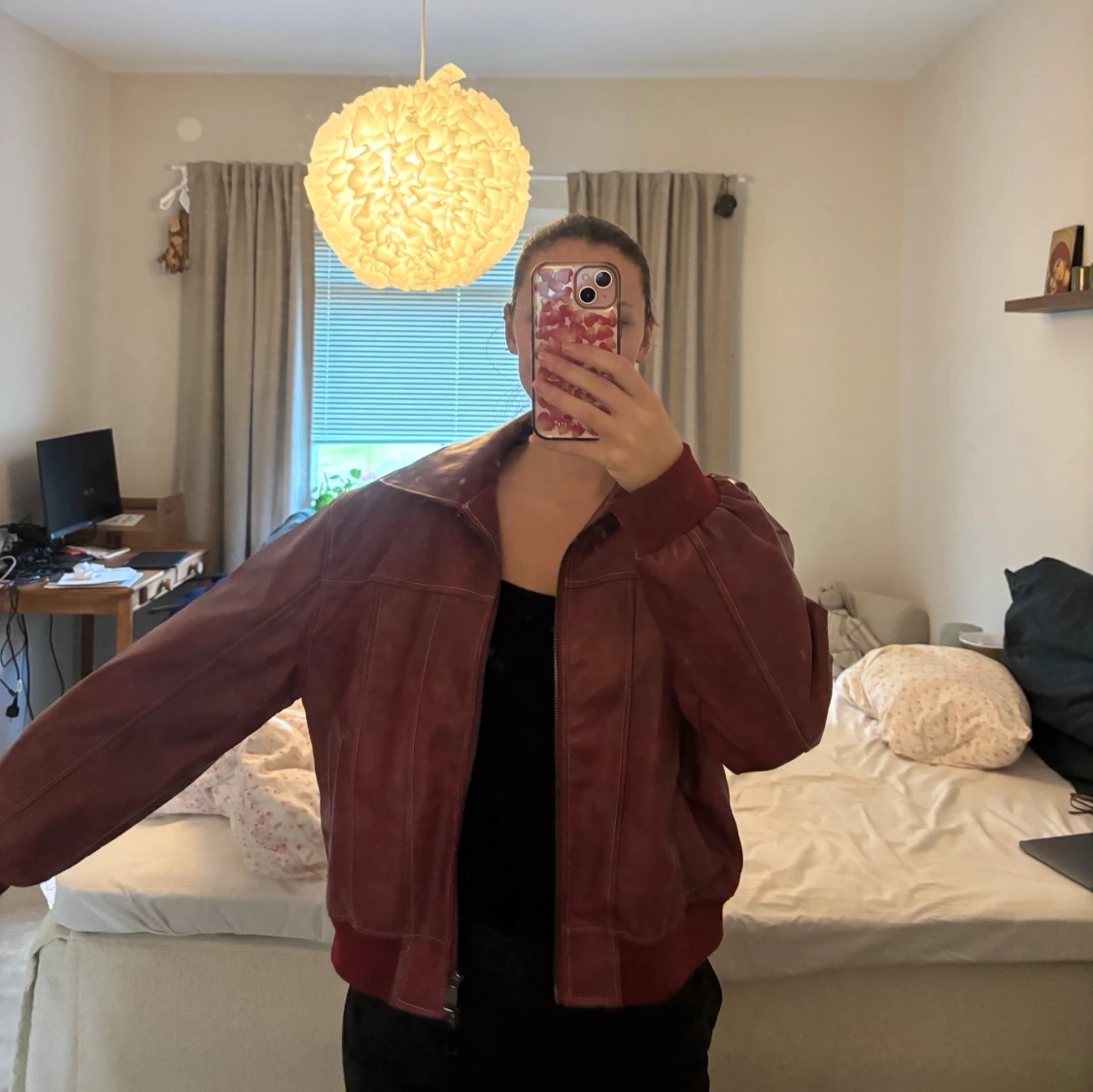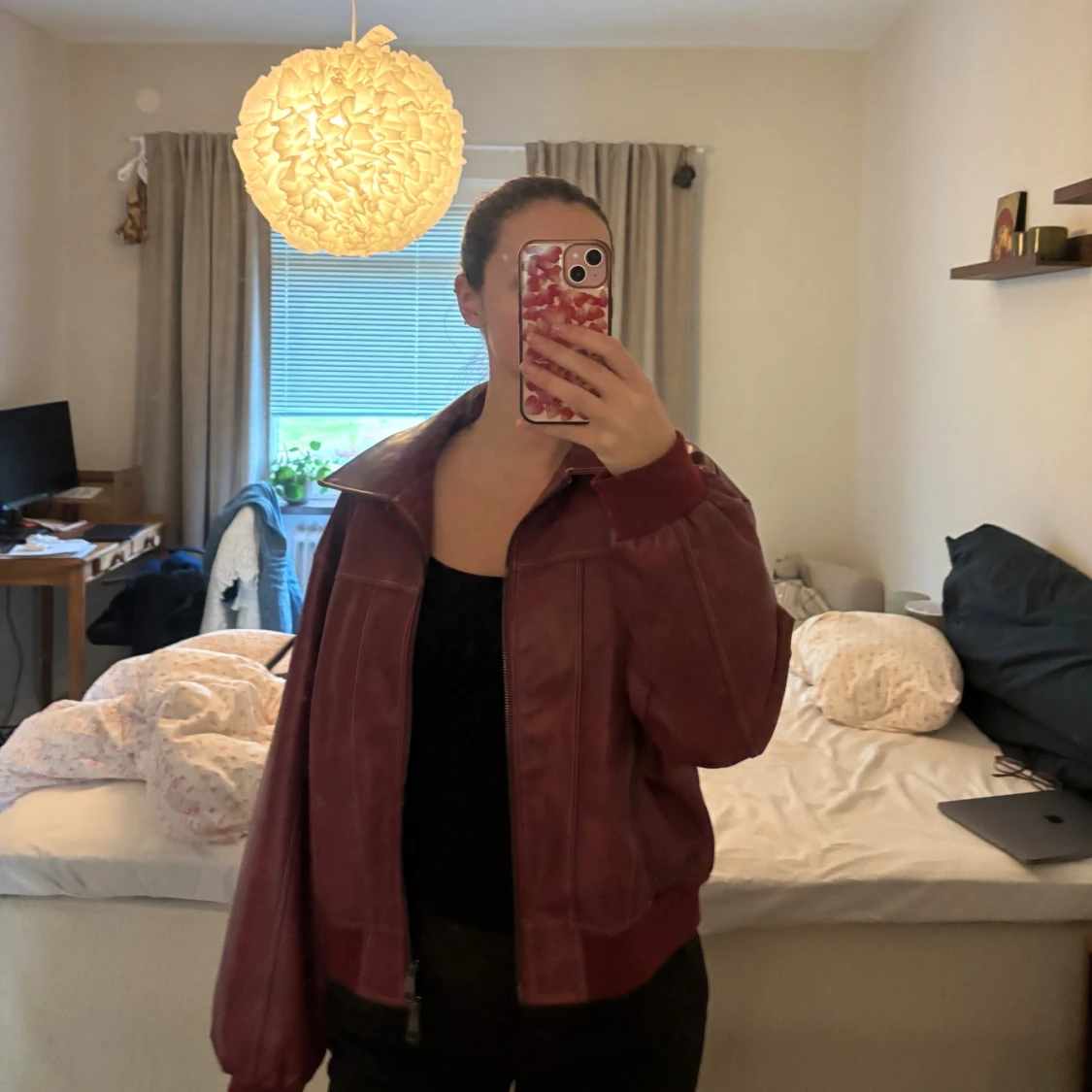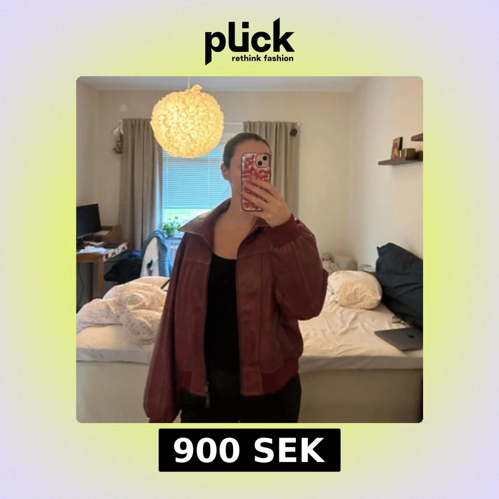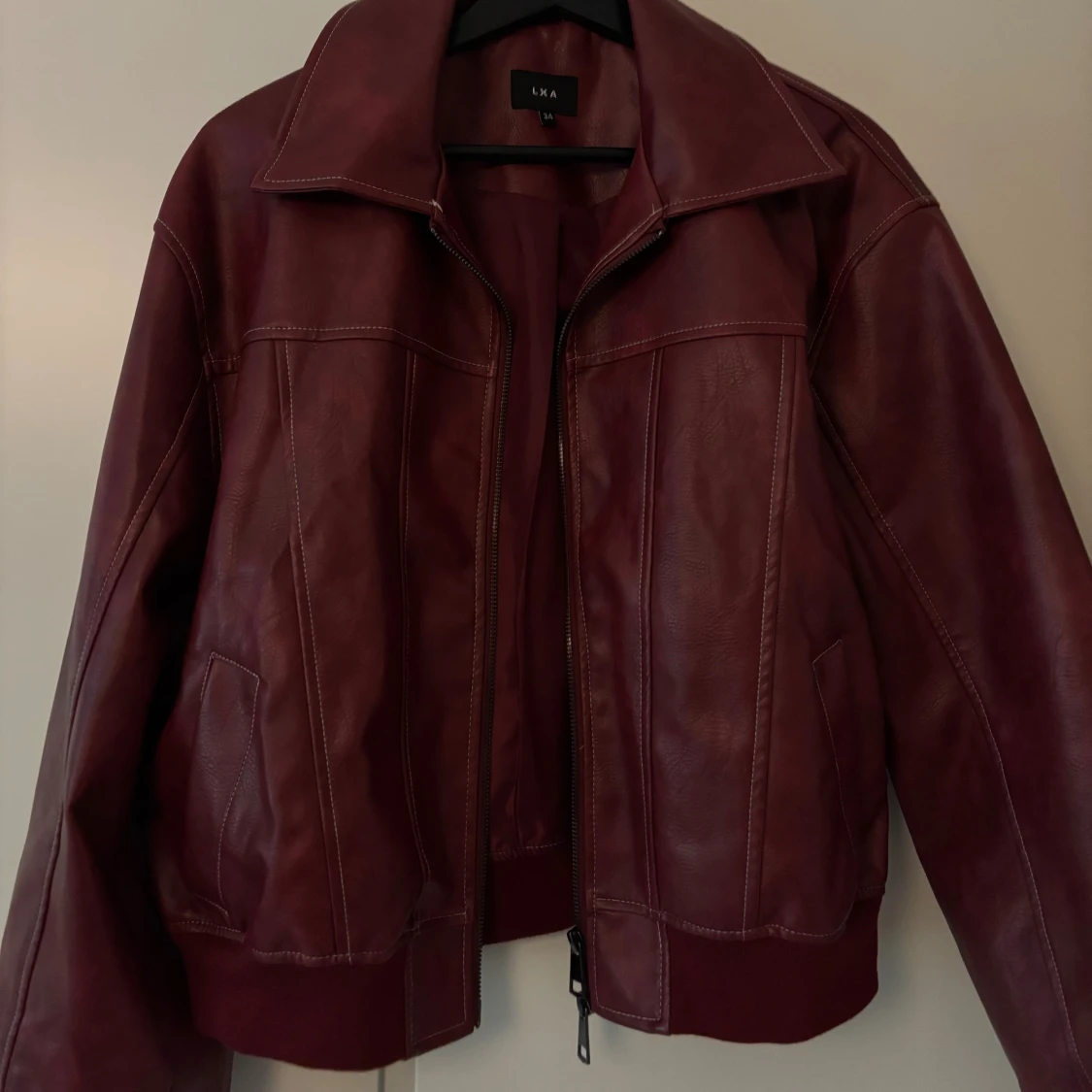 Säljer en vinröd skinnjacka från LXA i storlek 34. Jackan har bred krage, dragkedja framtill och ribbade muddar vid ärmslut och midja. Oversized passform och klassisk bomberstil som ger en cool vibe till din outfit.