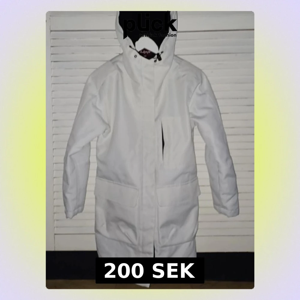 Stilren vit parkasjacka från Lipp, med lång passform och stor huva. Jackan har dragkedja framtill, stora fickor och en bröstficka. Perfekt för kalla dagar och enkel att matcha med olika outfits. Storlek XS, mycket stor i storleken.