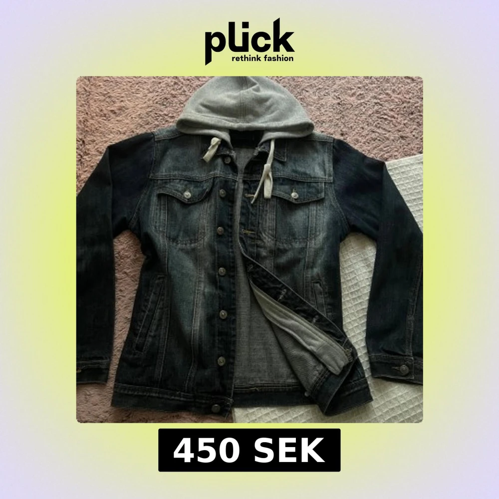 Snygg svart jeansjacka med tvättad look och grå huva i sweatshirtmaterial. Jackan har knappar framtill, två bröstfickor med lock och snörning i luvan. Perfekt för dig som gillar streetstyle och vill ha en avslappnad vibe.
