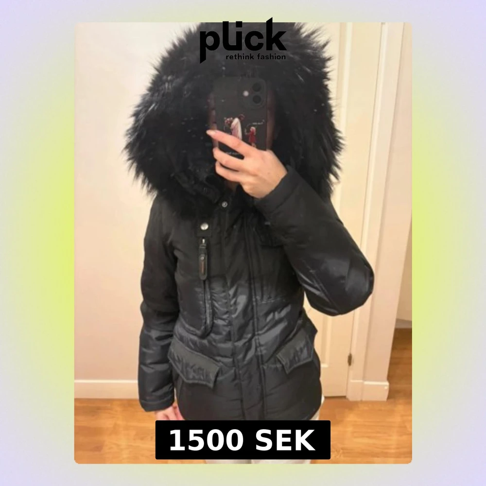 Säljer en svart pufferjacka från Hollies med stor fluffig päls på luvan. Jackan har dragkedja och knappar framtill, flera fickor med lock och en badge på ärmen. Perfekt för kalla dagar och har en snygg, figurnära passform. Använd endast en vinter