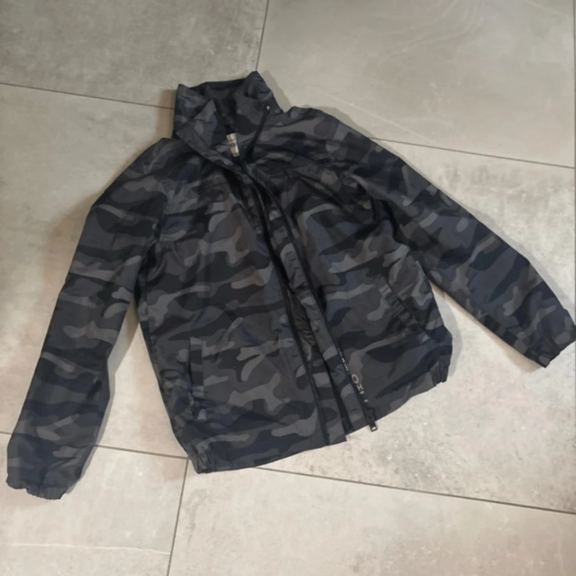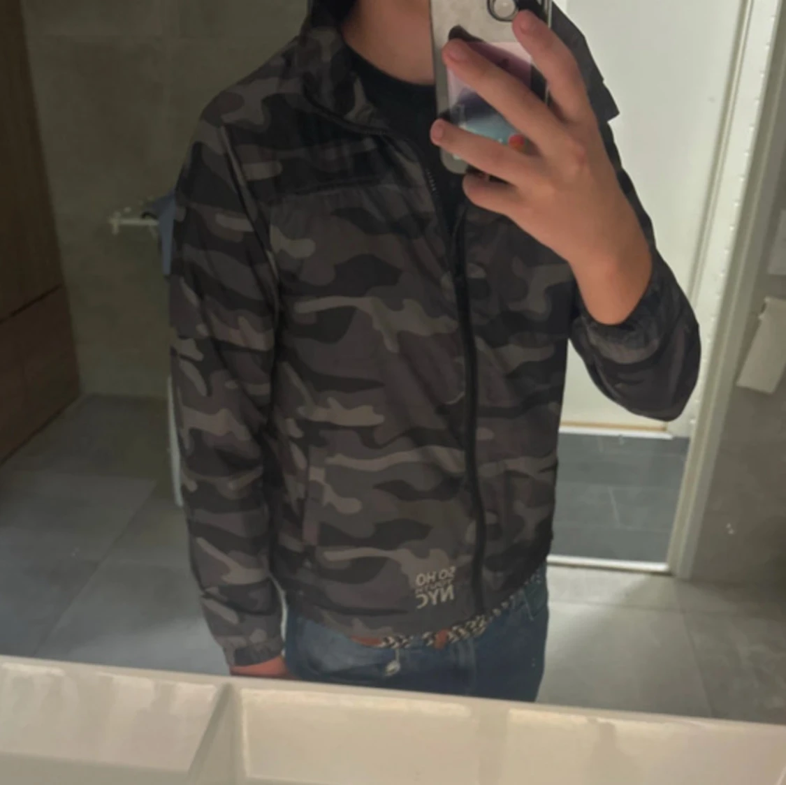 Snygg vindjacka i mörkgrått och svart camomönster från SOHO NYC. Jackan har dragkedja framtill, hög krage och elastiska muddar vid ärmslut och midja.