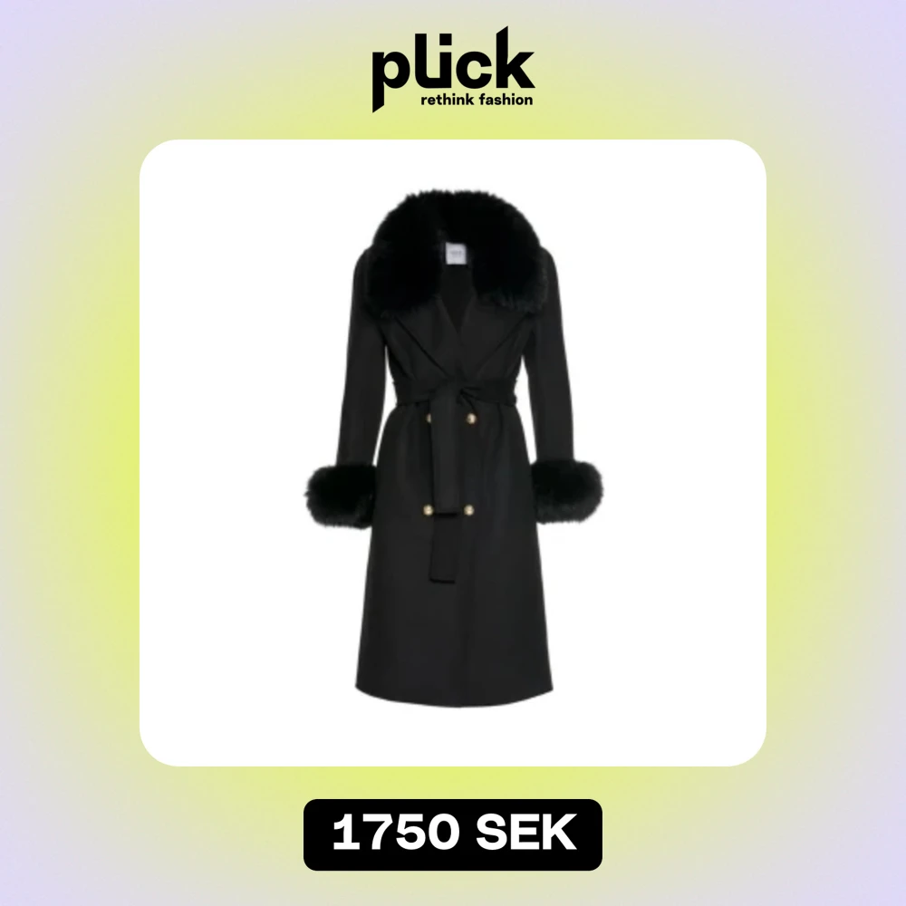 Svart kashmirkappa med knappar och midjeband. Avtagbar pälskrage och pälsmuddar på ärmarna. Bra skick då enbart använd ett par gånger.