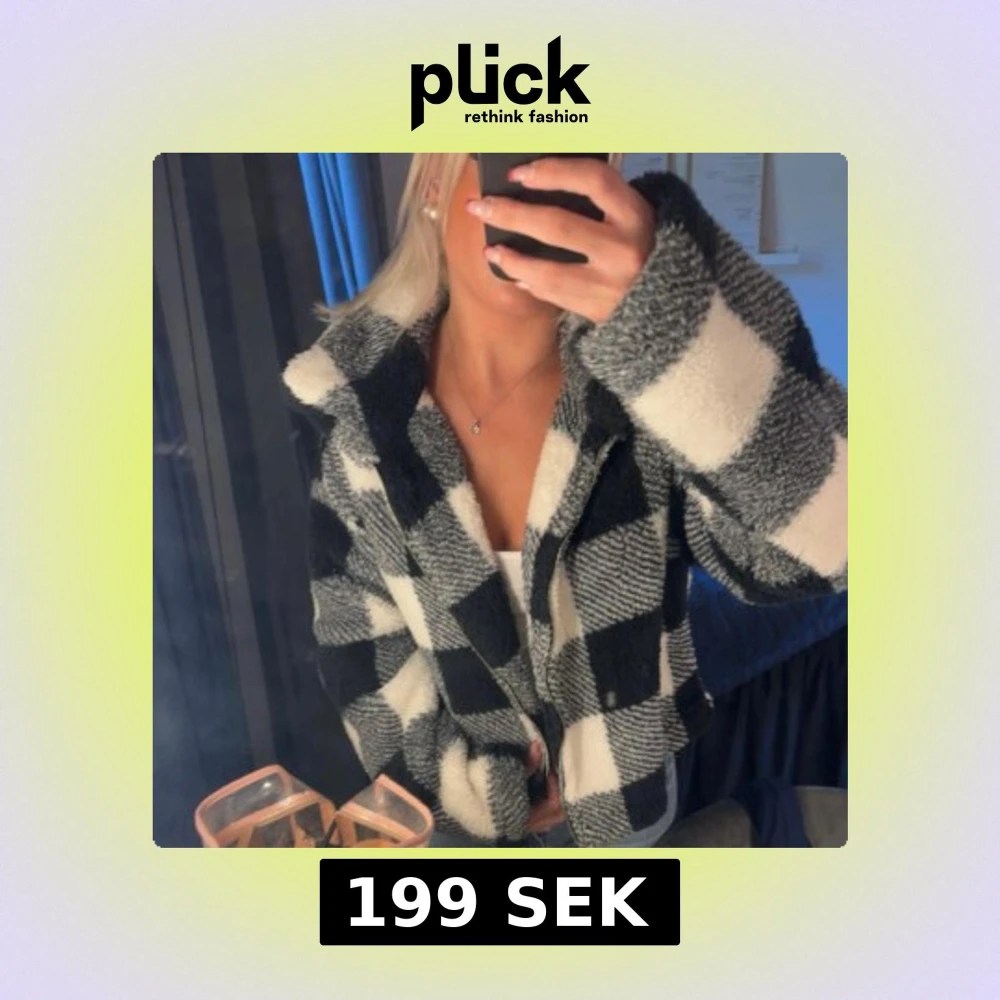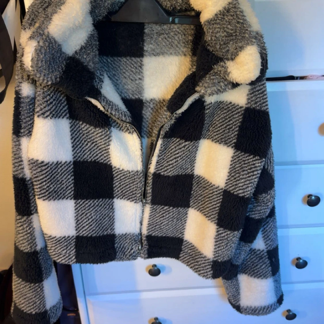 Supermysig teddyjacka med svart och vitt rutmönster. Jackan är croppad, har dragkedja framtill och en stor krage. Materialet är fluffigt och ger en riktigt cozy vibe.