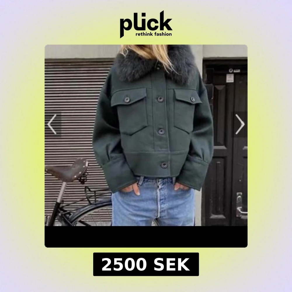 Snygg mörkgrön jacka med fuskpäls på kragen. Jackan har en croppad passform och knappar framtill. Perfekt för kyligare dagar med sina långa ärmar och stilrena design. Pris kan diskuteras!