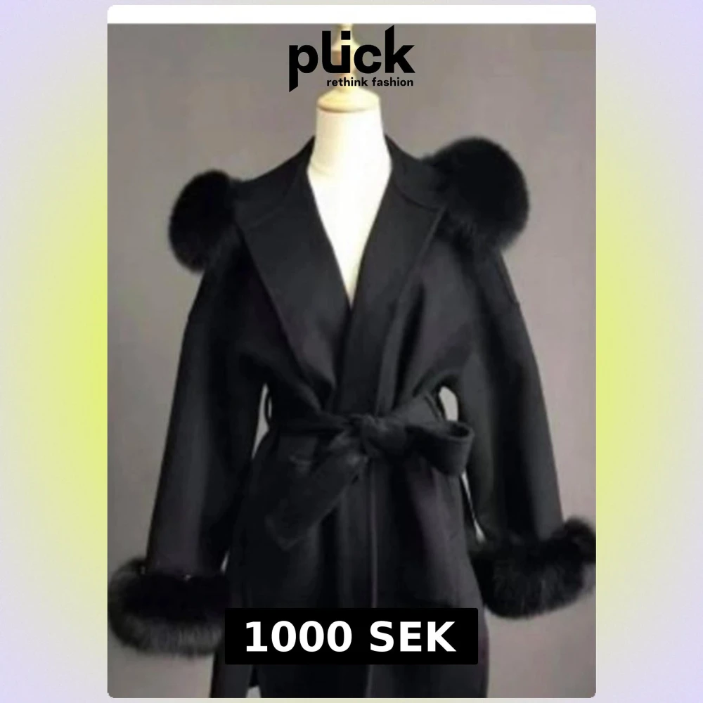 Snygg svart kappa med fluffiga pälsdetaljer på axlar och ärmslut. Jackan har ett brett bälte i midjan som knyts och ger en cool siluett. Perfekt för dig som vill sticka ut med en elegant och trendig look.