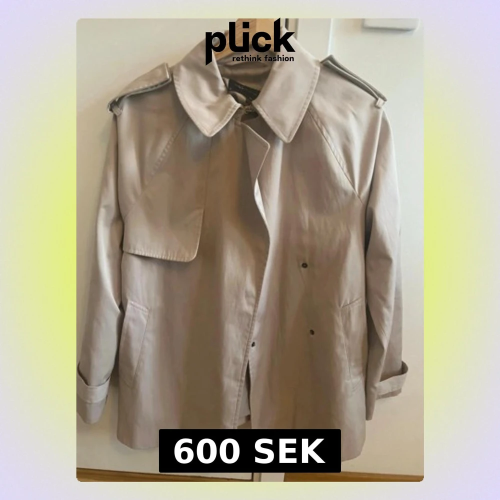 Snygg beige trenchcoat från M&S Collection med klassisk krage, axelklaffar och dubbelknäppning. Jackan har två stora fickor framtill och är tillverkad i ett slätt material som känns lätt och stilrent. Kan användas som storlek M också. Är öppna med att diskutera priset!
