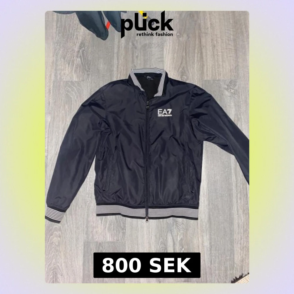Snygg svart jacka från EA7 Emporio Armani med vita ränder på muddar och krage. Jackan har dragkedja framtill, två fickor och logga på bröstet. Perfekt för dig som vill ha en stilren och sportig look. Är large men passar riktig bra på S&M (Det som står i ”storlek” är inte rätt storlek)