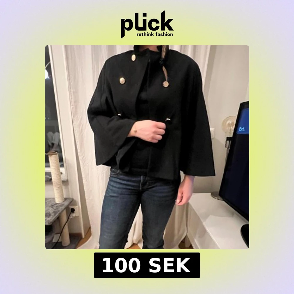 Elegant svart kappa med stora dekorativa knappar. Den har en lös passform och trekvartsärmar, vilket ger en stilren och modern look. Perfekt för både höst och vår. Säljer för den inte kommer till användning.