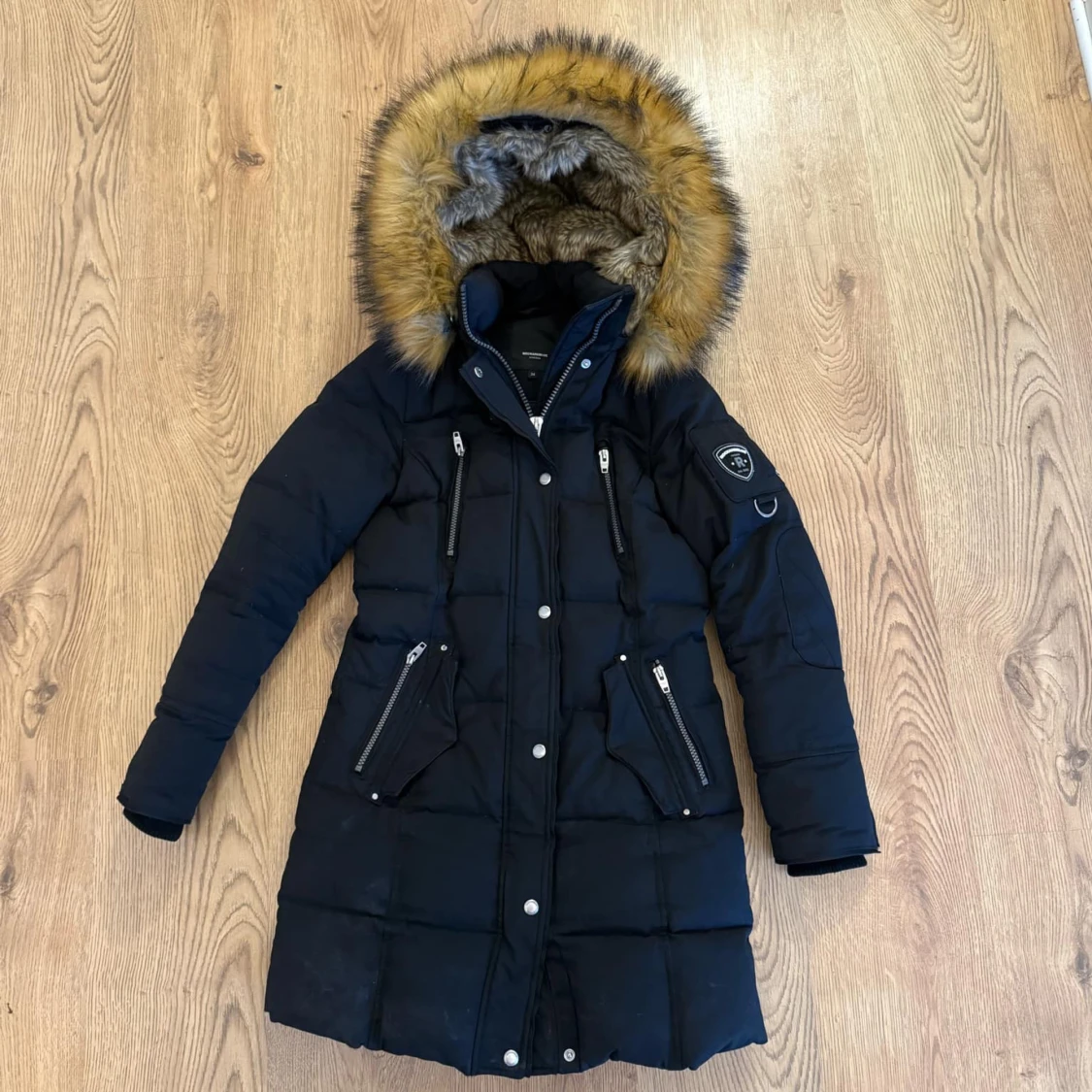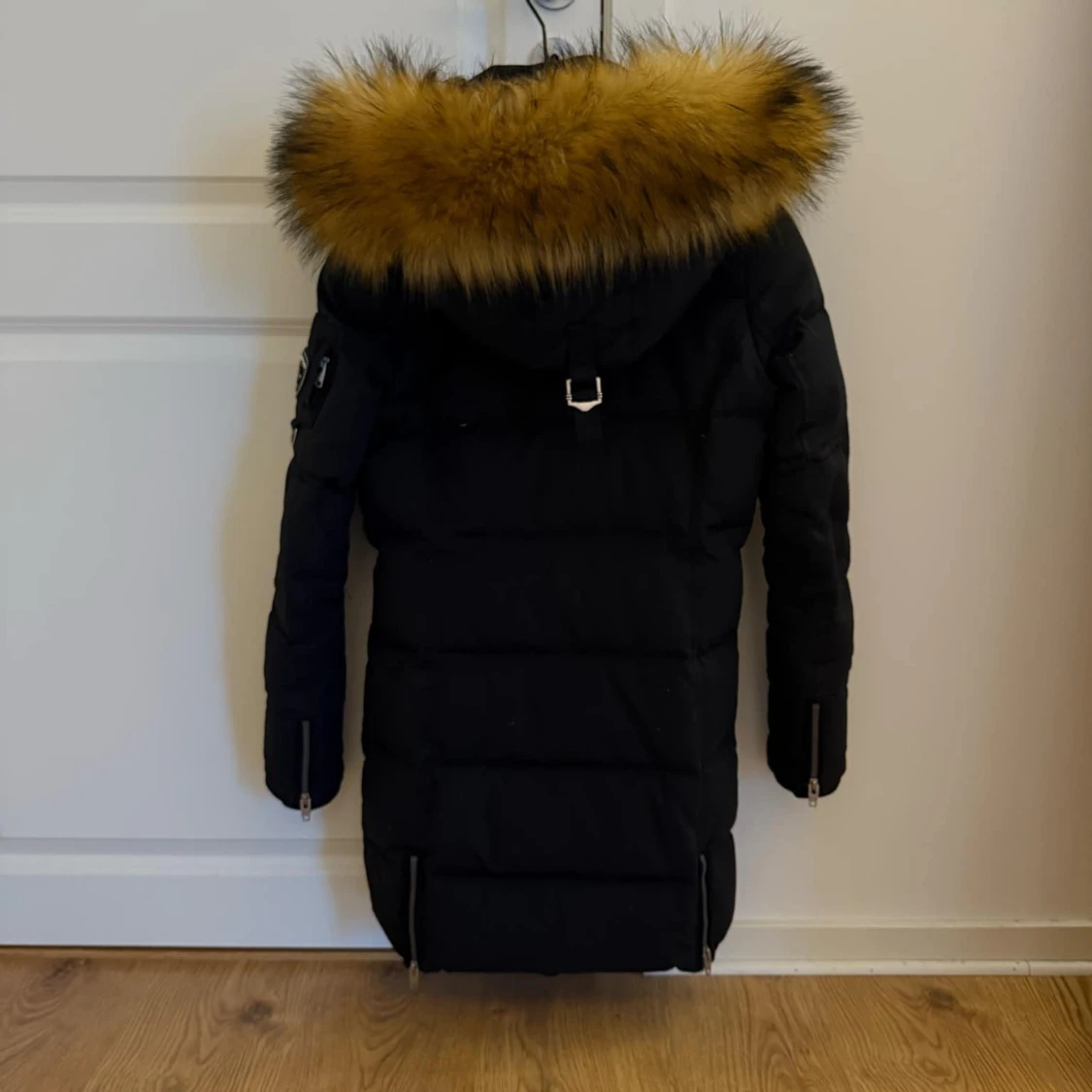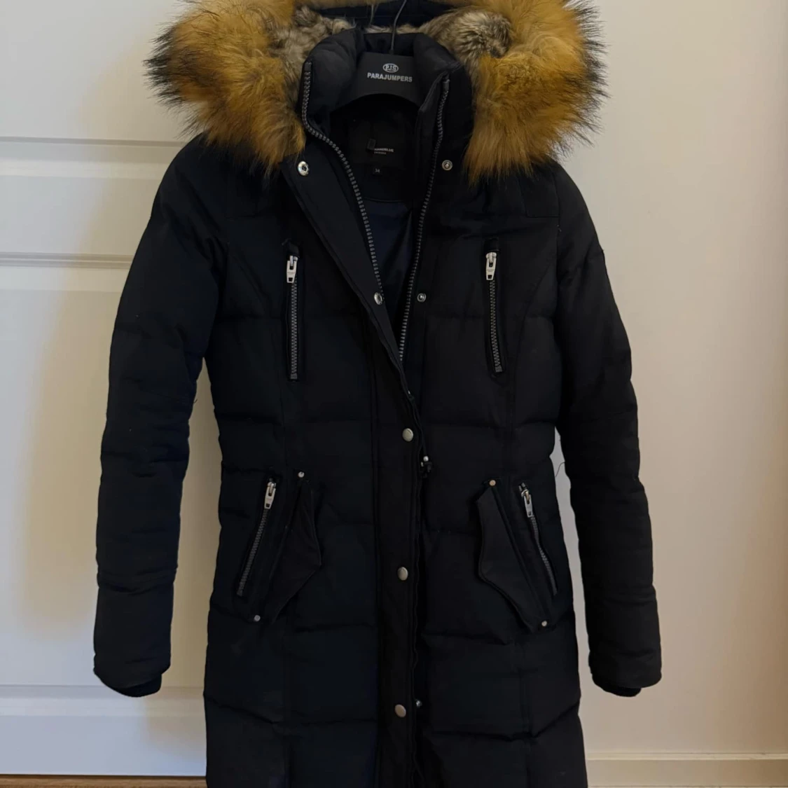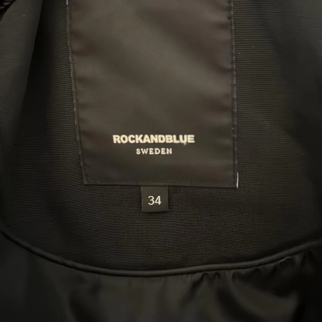 Snygg svart dunjacka från Rockandblue med pälskantad huva. Jackan har flera dragkedjefickor och knäppning framtill. Perfekt för kalla dagar med sin långa design och varma foder. Storlek 34 knappt använd.