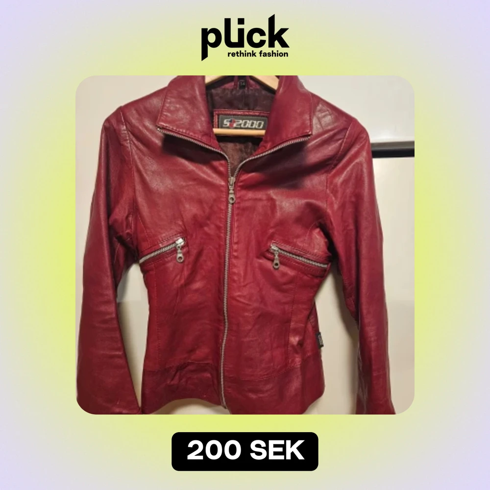 Vintage y2k röd skinnjacka/racing från S2000 med dragkedja framtill och två dragkedjeförsedda fickor på sidorna. Jackan har en feminin passforml. Skador - se sista bild vid ärmarna längst ner, trasig söm / l