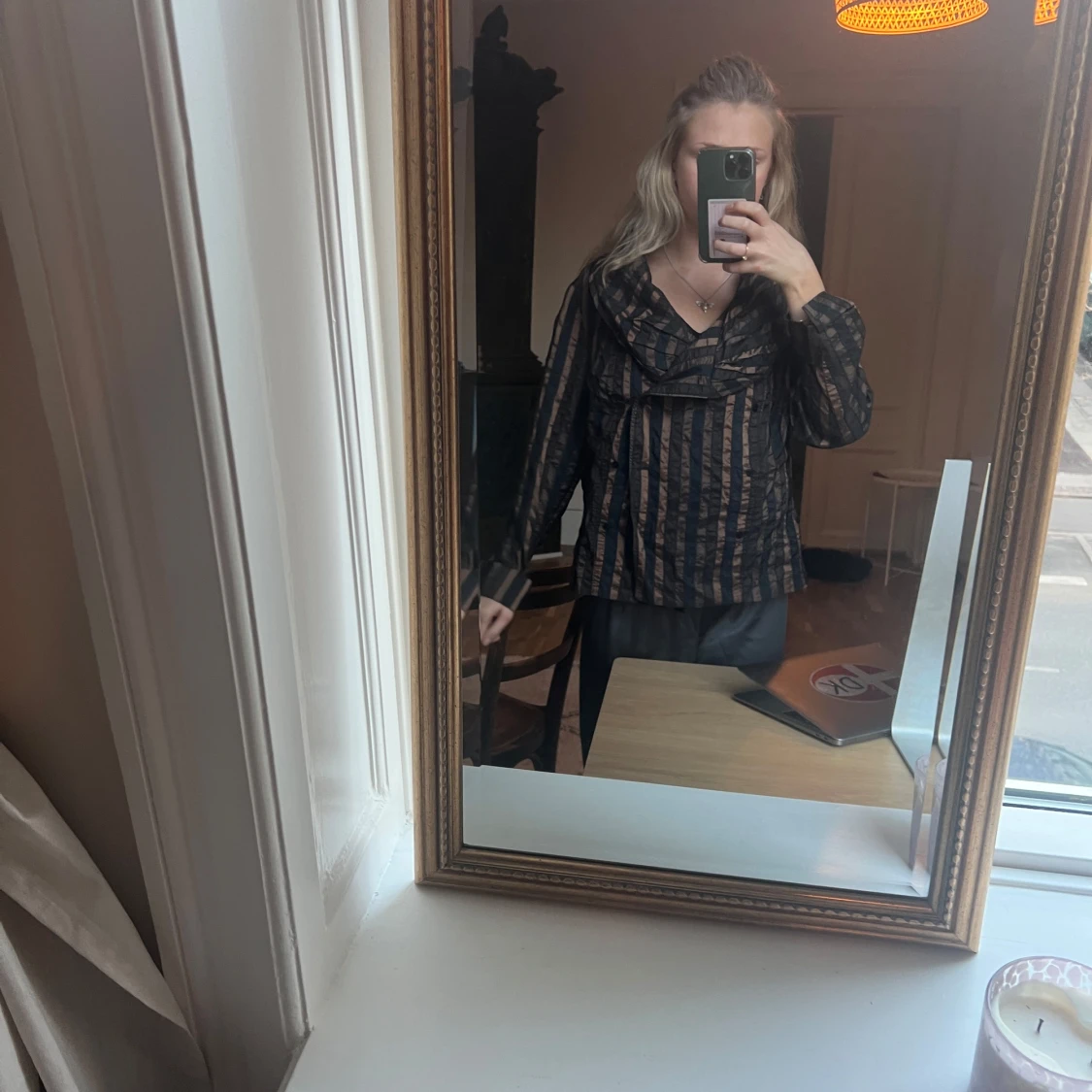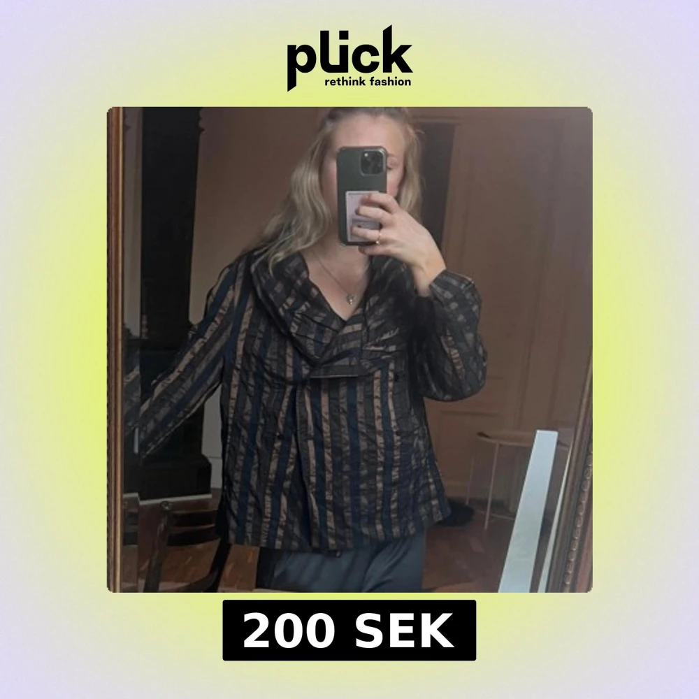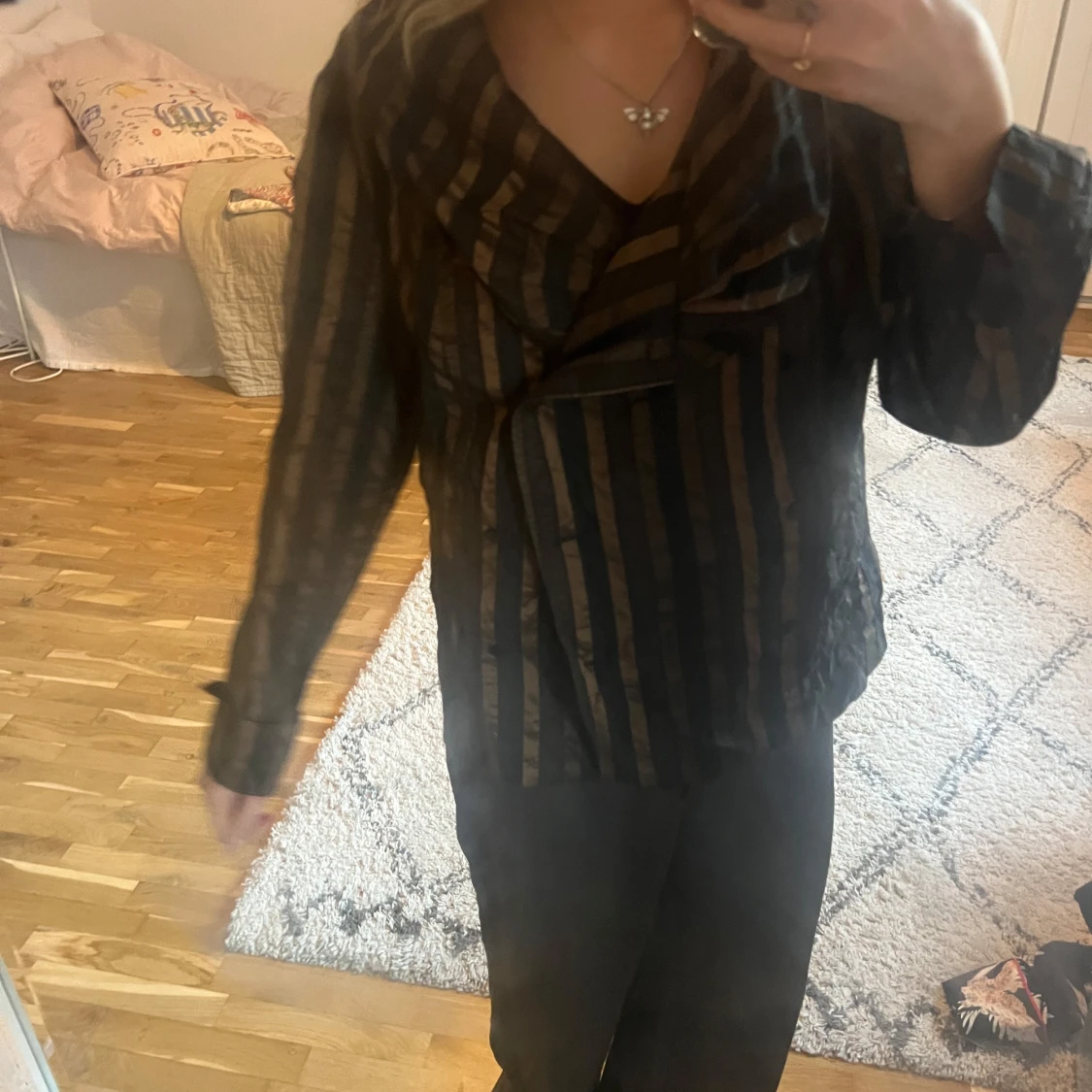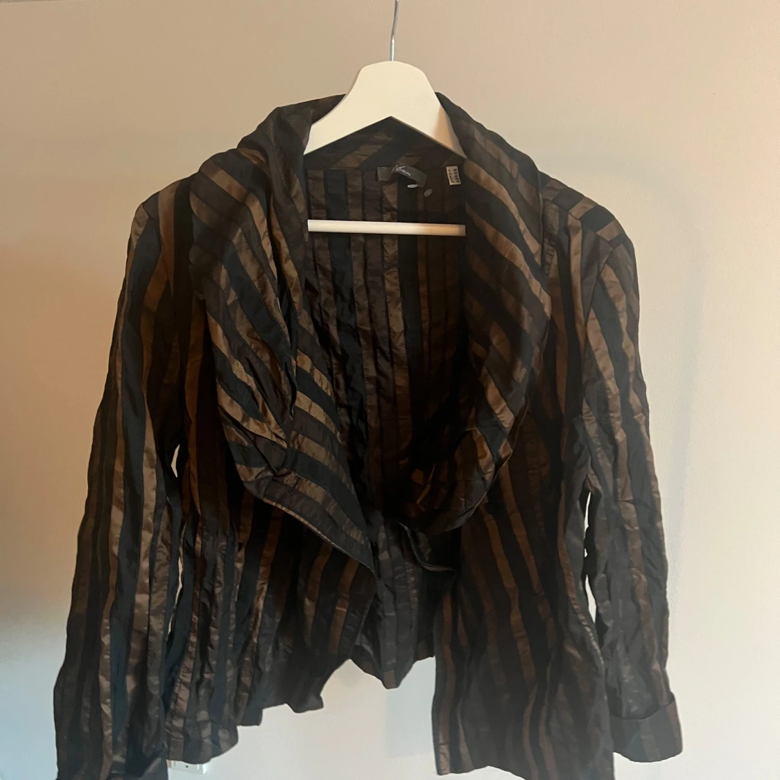 Säljer en svart och brun jacka med breda ränder och stor, draperad krage. 😍