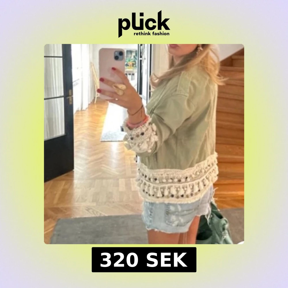 Snygg grön jacka med unika virkade detaljer och fransar vid ärmslut och nederkant. Perfekt för att ge din outfit en bohemisk touch. Jackan har en normal passform och är idealisk för vår och sommar.