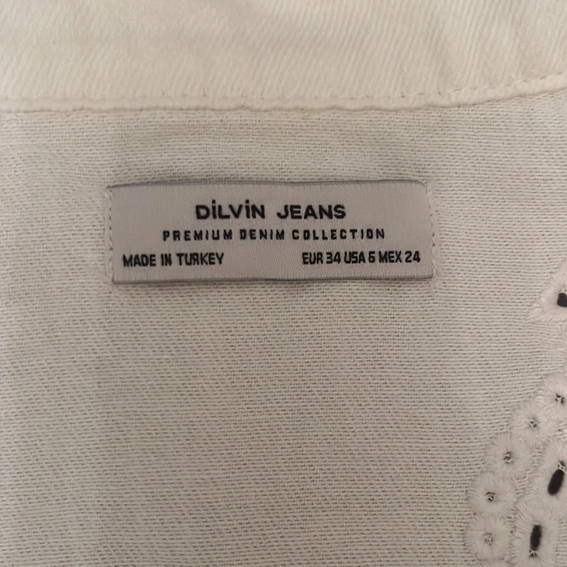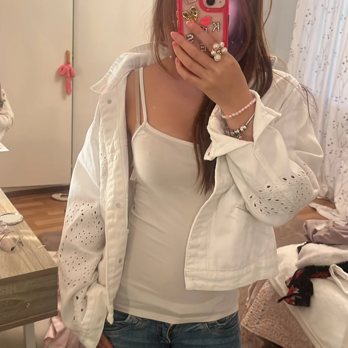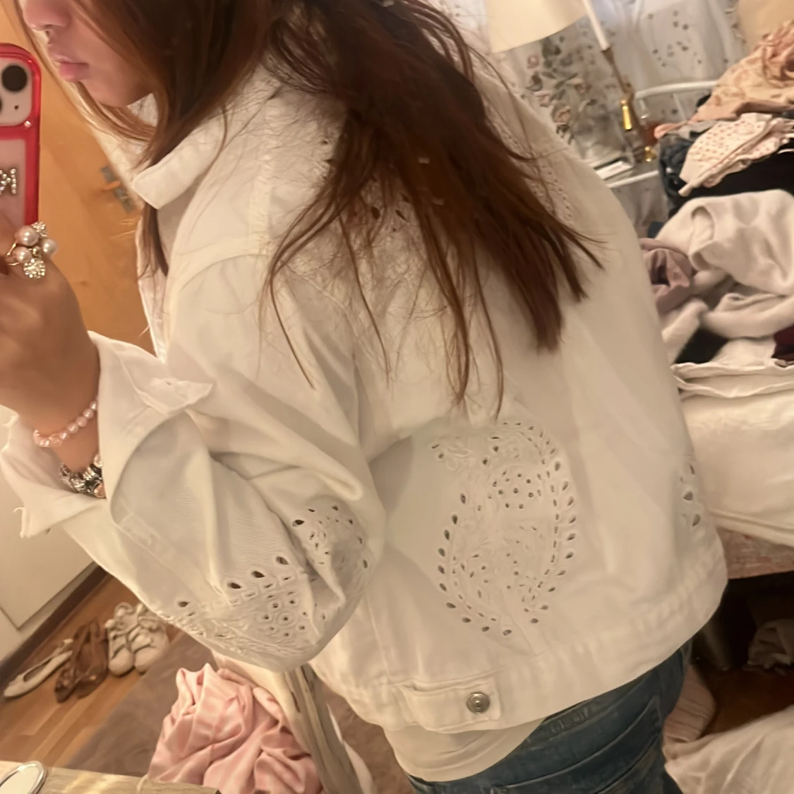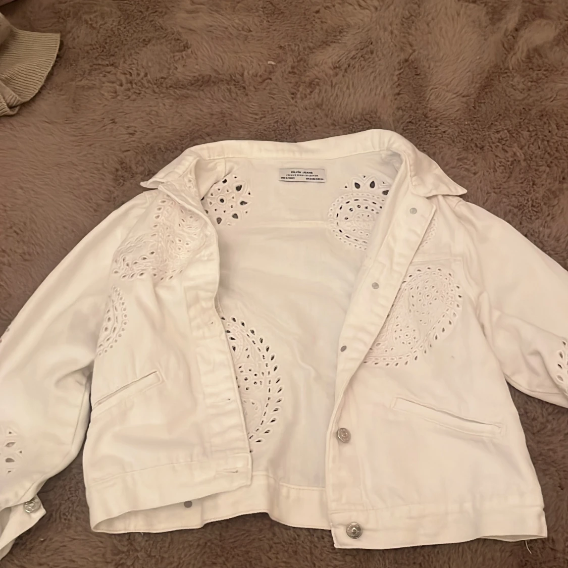 Säljer en vit jeansjacka från Dilvin Jeans med snygga broderade hålmönster på ärmar och framstycke. Jackan har klassisk krage, knappar framtill och två fickor. Perfekt för dig som vill ha en unik och fräsch look.