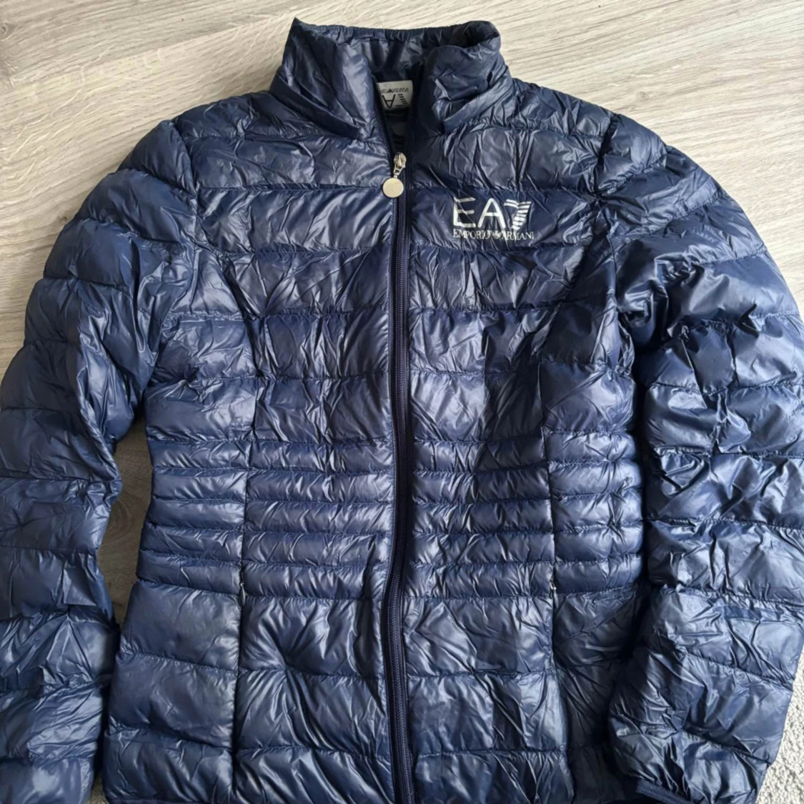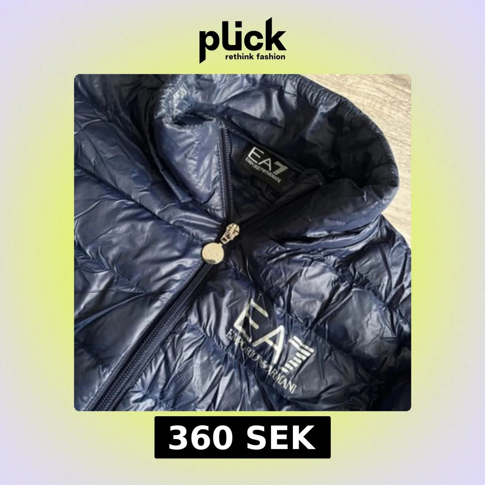 Storleken är lite oklar, men jag tippar att man kan ha den om man har 34-36. Den är figursydd. Snygg mörkblå pufferjacka från Emporio Armani med dragkedja och hög krage. Perfekt för kyliga dagar med sin quiltade design och stilrena look.