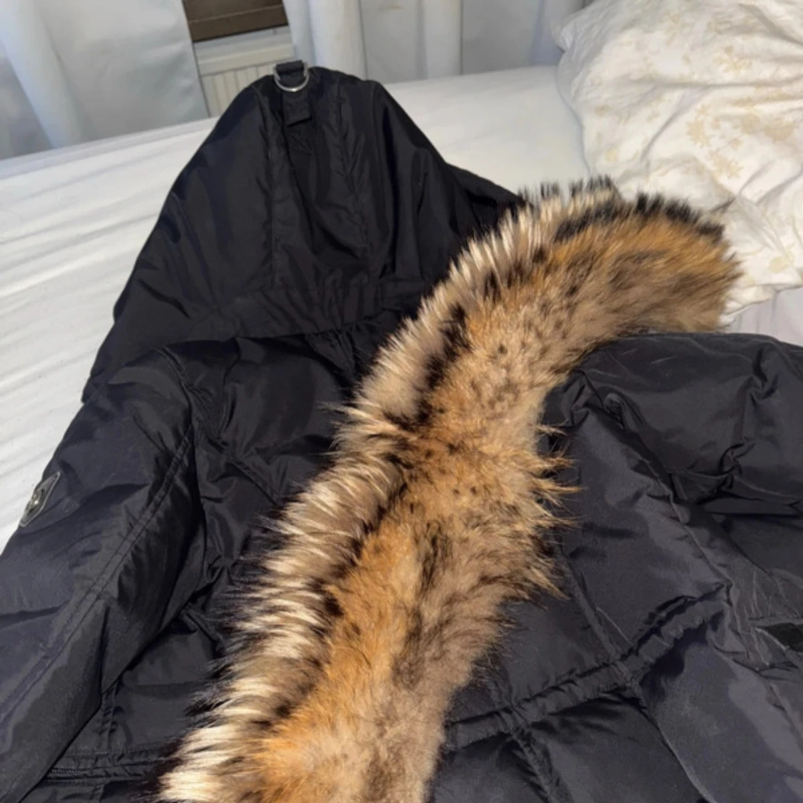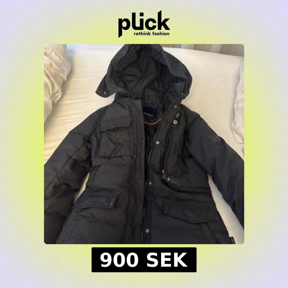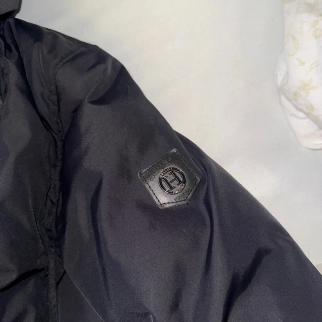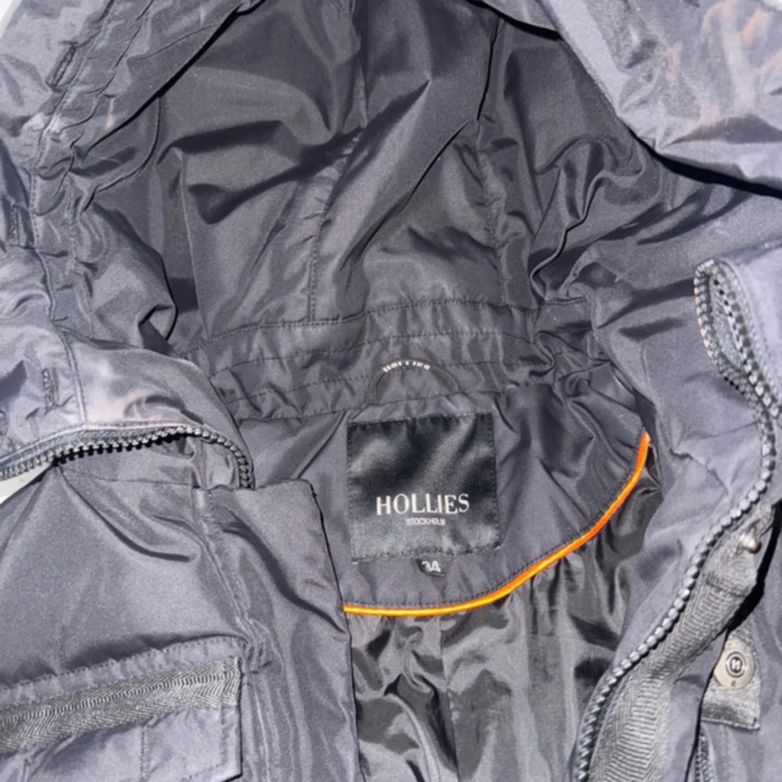 Säljer en svart dunjacka från Hollies med huva och flera praktiska fickor. Jackan har dragkedja och knappar framtill för extra skydd mot kyla. Perfekt för kalla dagar!
