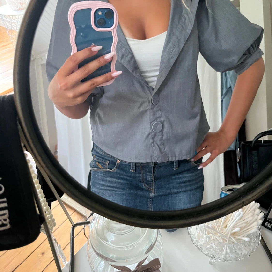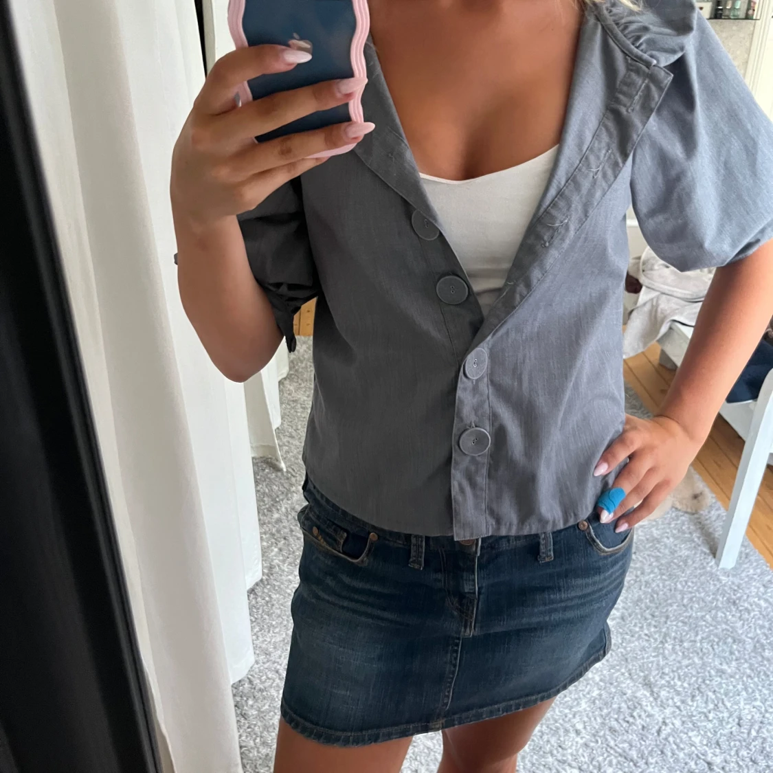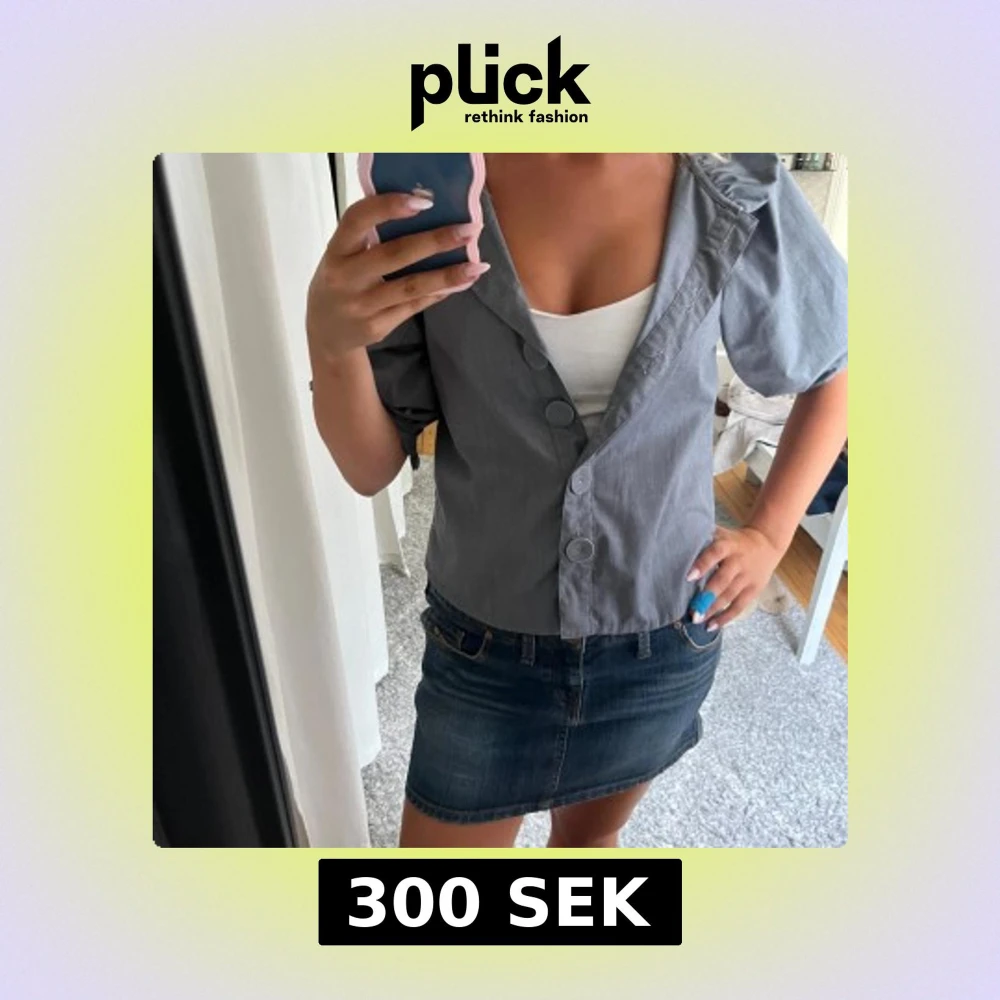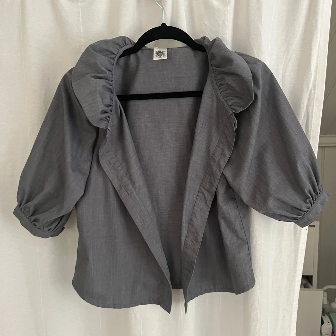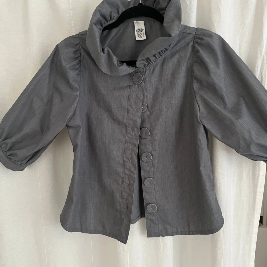 Säljer en grå overshirt med bred krage och puffiga trekvartsärmar. Jackan har stora dekorativa knappar framtill.