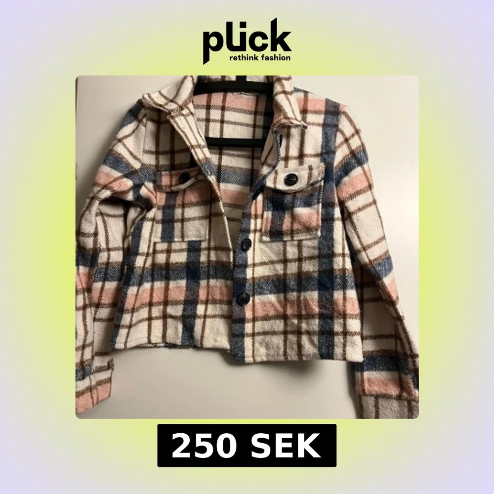 Säljer en snygg rutig jacka från Ullared i vit, blå och rosa. Jackan är croppad med knappar framtill och har två bröstfickor med knappar. Perfekt för en trendig look!