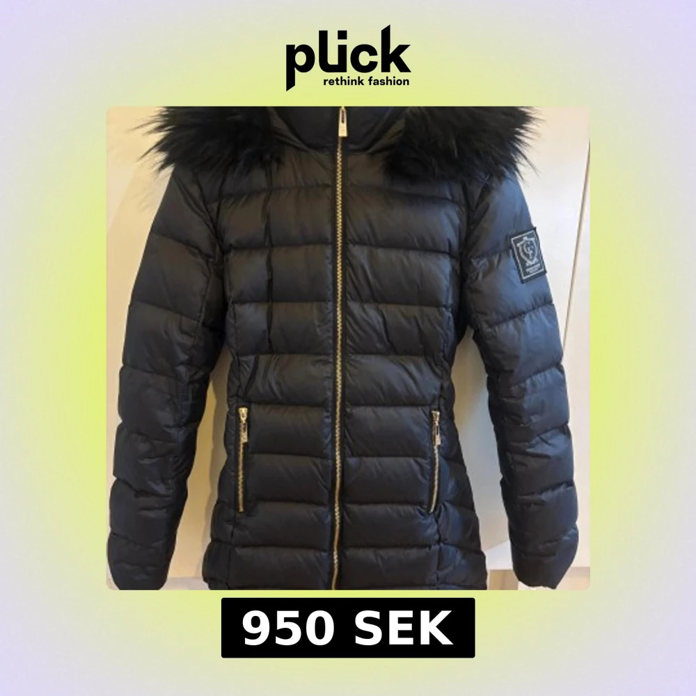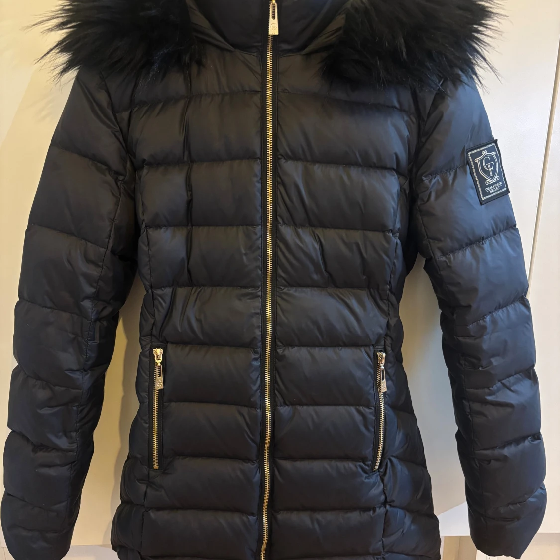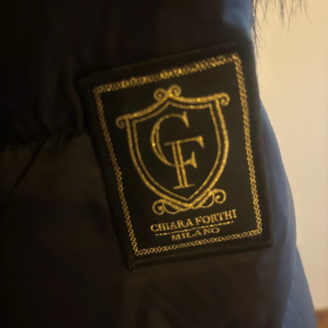 Snygg svart pufferjacka från Chiara Forthi med fluffig fuskpäls runt huvan och guldiga dragkedjor. Jackan har quiltad design, lång arm och en patch med logga på ena ärmen. Perfekt för kalla dagar när du vill vara både varm och stilren.